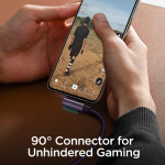 Dankzij het haakse uiteinde houdt de kabel de poort in de telefoon vast en wordt de gegevensoverdracht beveiligd.