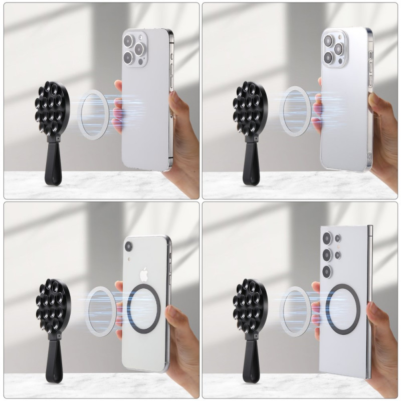 Deze anti-slip magnetische telefoonhouder met zuignap biedt een eenvoudige, ultra-veelzijdige oplossing voor het bevestigen van je smartphone op elk glad oppervlak: spiegel, glas, tegels, computerscherm of zelfs koelkast. Hij is ontworpen voor MagSafe en biedt een krachtige en directe magnetische houvast voor iPhone 12 tot 15 of compatibele hoesjes. Het systeem van 14 minizuigers bootst de structuur van een octopus na voor een betrouwbare grip. Hij is gemaakt van siliconen van hoge kwaliteit en beschermt je telefoon terwijl hij flexibel, duurzaam en licht blijft. Ideaal voor het maken van content, het voeren van videogesprekken of om van je iPhone een professionele webcam te maken.