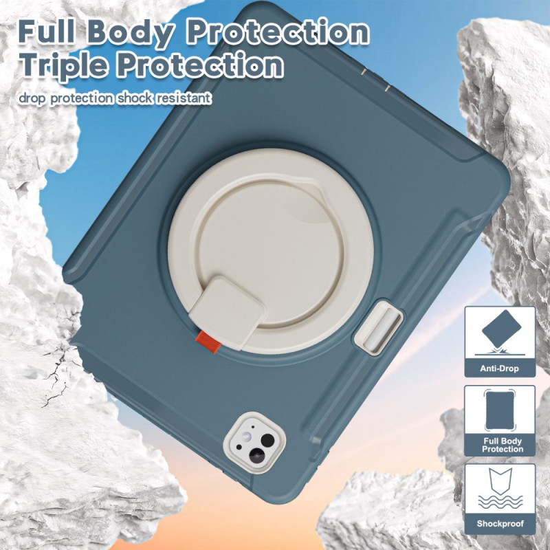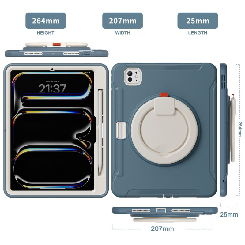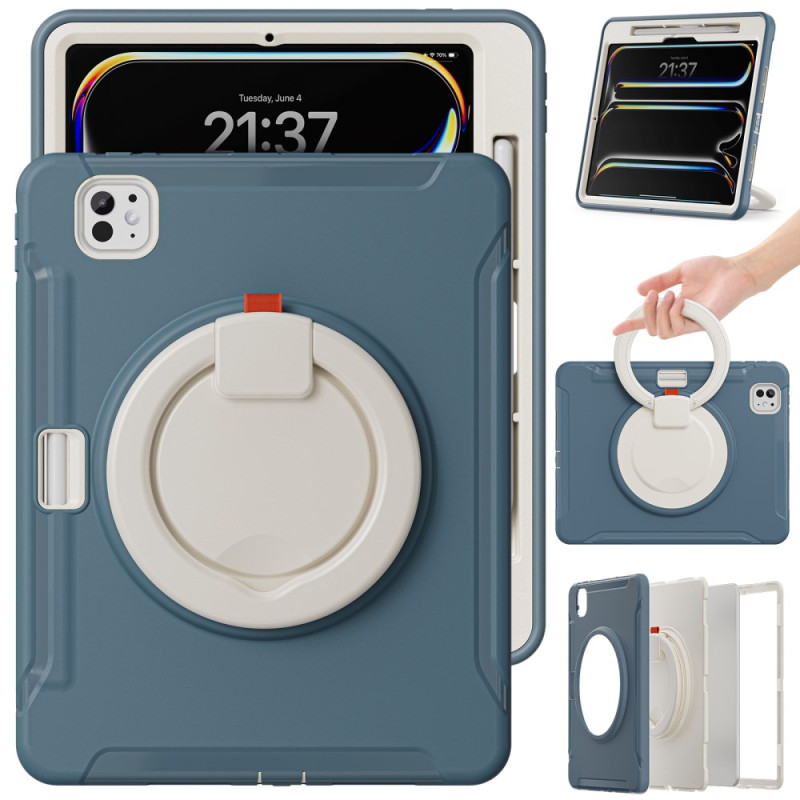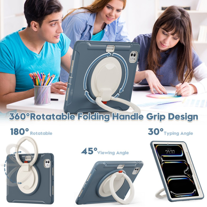 Ontdek onze innovatieve beschermhoes voor iPad Pro 11 (2025) / 11 (2024). Hij heeft een 360 graden draaibare handgreep en een geïntegreerde standaard en biedt optimale bescherming dankzij de robuuste drielagenstructuur. Geniet van volledige bescherming tegen stoten en vallen, terwijl je ook profiteert van praktische opbergruimte voor je stylus.