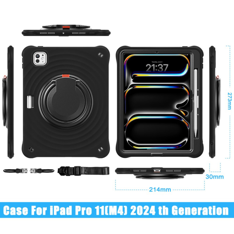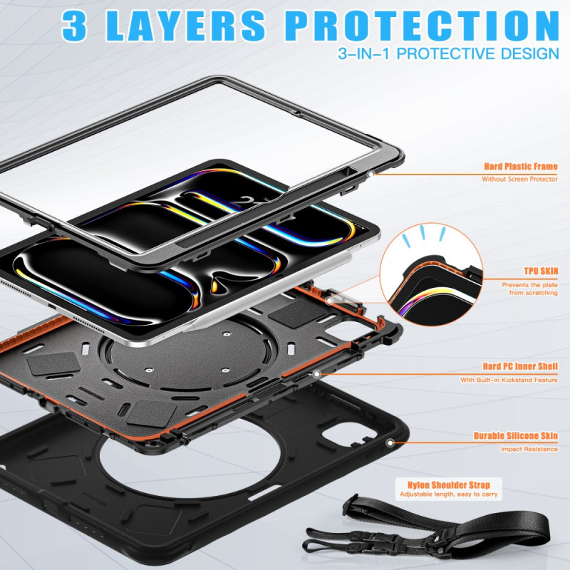 Deze robuuste hoes voor iPad Pro 11 (2025) / 11 (2024) biedt superieure bescherming dankzij het hybride ontwerp. Hij is voorzien van een 360° draaibare standaard, stylussleuf, schokabsorberend ontwerp en roterend handvat. Hij is ideaal voor werk en ontspanning en wordt geleverd met een verstelbare schouderriem om hem gemakkelijk mee te nemen.