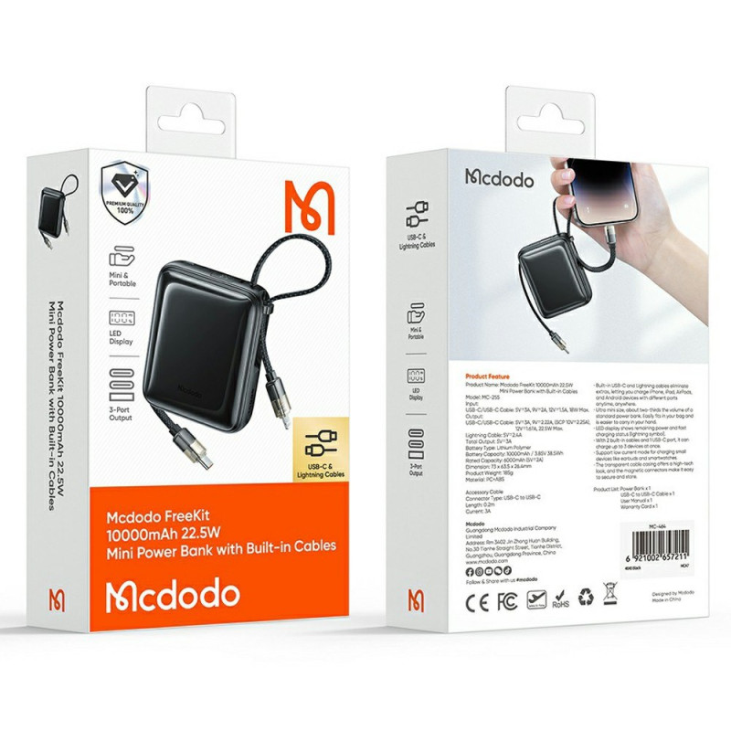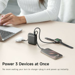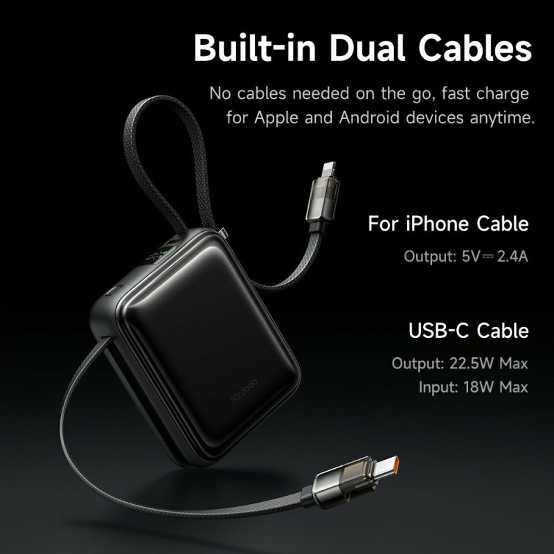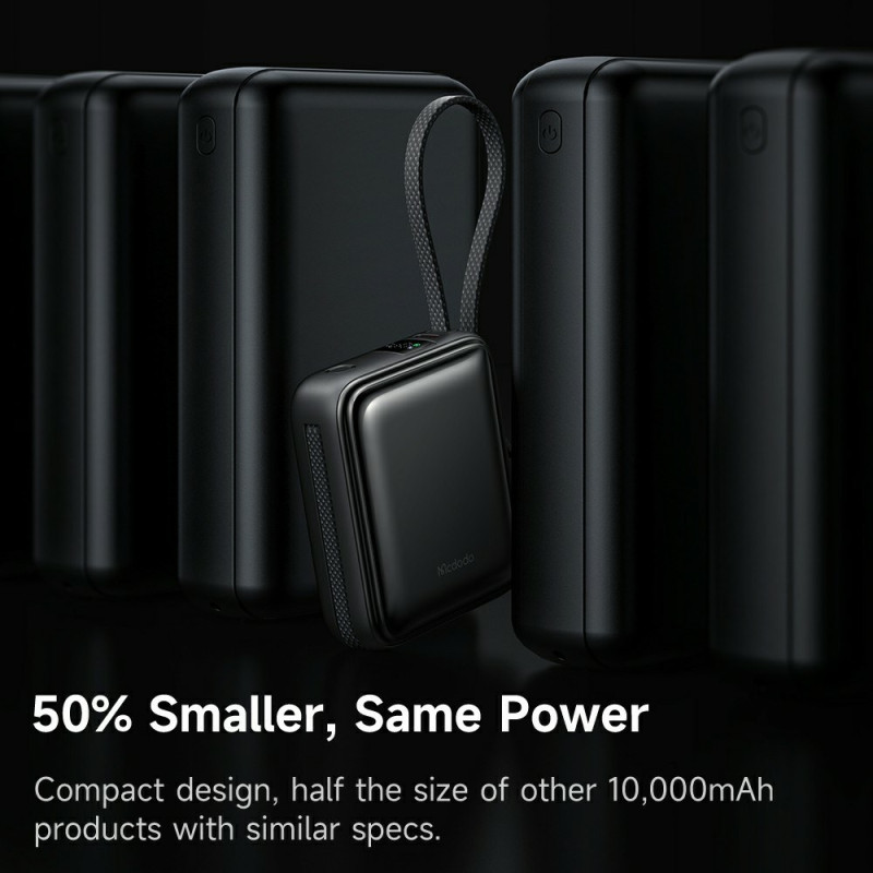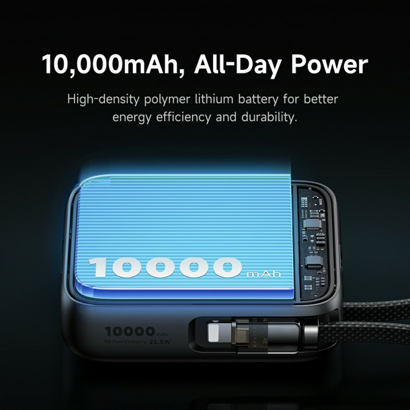 Kracht met hoge capaciteit en ultracompact formaat zijn nu gecombineerd in deze draagbare energieoplossing. Deze 10000mAh externe batterij is ontworpen om minimale ruimte in te nemen dankzij het miniatuurformaat (73 x 63,5 mm) en de geïntegreerde kabels. Hij levert een maximaal uitgangsvermogen van 22,5 W, wat zorgt voor het ultrasnel opladen van je apparaten. Het opladen van de batterij zelf is geoptimaliseerd met een snelle input van 18 W. Het digitale display maakt nauwkeurige controle van het oplaadniveau mogelijk, zodat je de levensduur van de batterij moeiteloos kunt beheren.