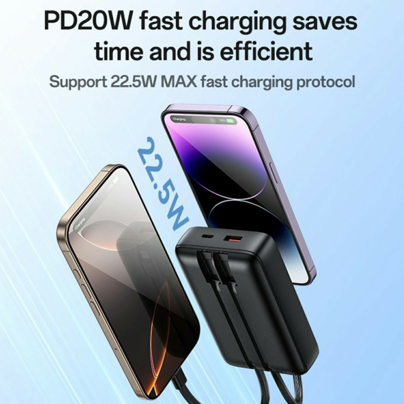 Het einde van de rommel is eindelijk hier. Deze YESIDO YP85 externe batterij lost de uitdagingen van autonomie en kabelbeheer onderweg op. Met zijn kolossale capaciteit van 20.000 mAh garandeert hij meerdere oplaadbeurten voor al je apparaten. Het ontwerp integreert Type-C en Lightning kabels, zodat je geen extra draden hoeft mee te nemen. Hij levert 22,5 W snellaadvermogen via de USB-uitgangen en Type-C kabel. Intelligent energiebeheer, gecombineerd met NTC-regeling, zorgt voor veilig en efficiënt opladen, en het digitale display zorgt voor constante controle van de resterende capaciteit.