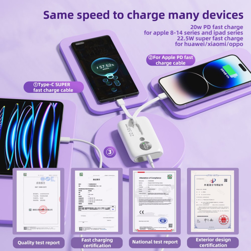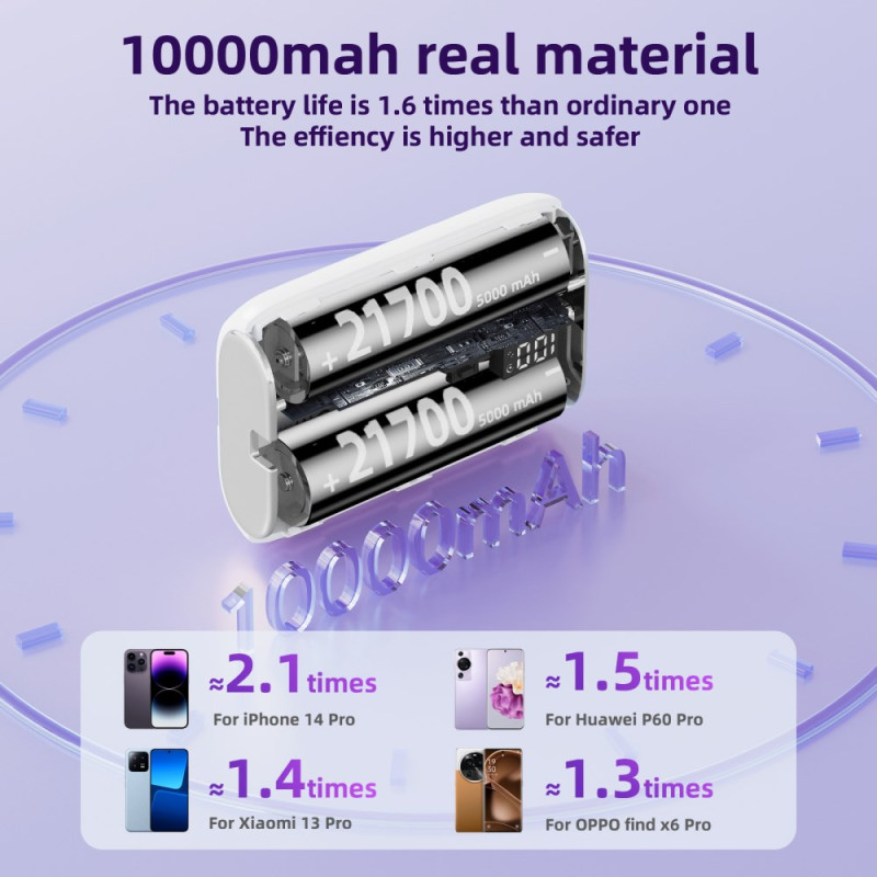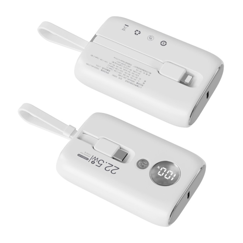 Geavanceerde thermische controle en kabelintegratie herdefiniëren snel opladen in zakformaat. Deze ROISKIN 10000mAh externe batterij is ontworpen voor maximaal gemak: hij integreert twee kabels (Type-C en Lightning) die ook dienst doen als handriem. Het laadvermogen bereikt 22.5W (via de Type-C kabel), terwijl het gebruik maakt van een nieuwe generatie chip om een lage temperatuur te handhaven en de gezondheid van de batterijen te behouden. Het intelligente digitale display geeft precies aan hoeveel batterij er nog over is en vervangt de indicatorlampjes. Compact en lichtgewicht, de perfecte bondgenoot voor mobiliteit.