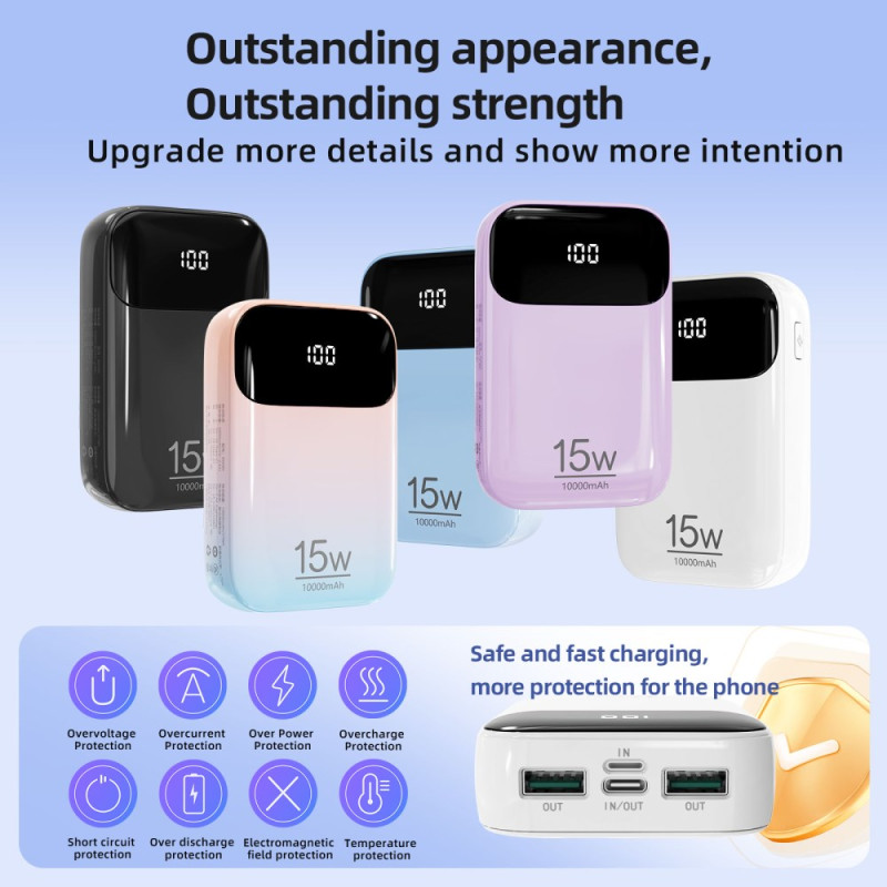 Het conflict tussen opladen via een kabel en comfort in de hand wordt opgelost door de ergonomische vormgeving van dit ROISKIN apparaat. Deze 10000mAh externe batterij integreert twee oplaadkabels (Type-C en Lightning) die ontworpen zijn voor 180 graden gebruik, zonder het gebruik van het apparaat te hinderen. Met vijf beschikbare uitgangen kan hij meerdere apparaten tegelijk opladen. Een groot, duidelijk digitaal display maakt het gemakkelijk om de levensduur van de batterij te controleren. Het apparaat is beveiligd met negen niveaus van intelligente beveiliging en voldoet aan de Europese CE-RoHS-normen.