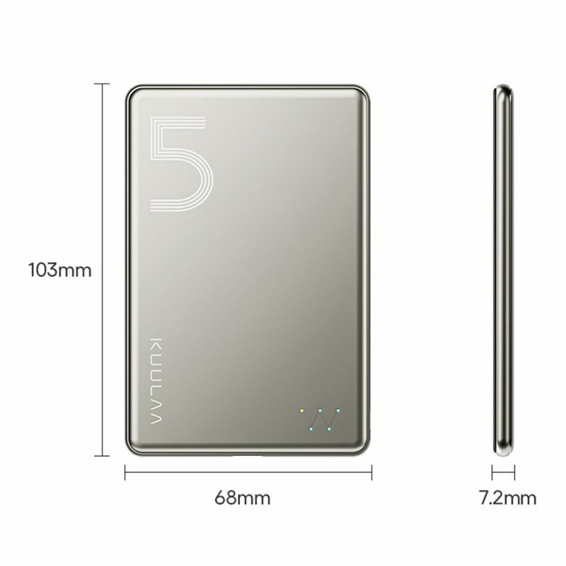 De combinatie van minimalistische elegantie en magnetische kracht definieert dit nieuwe segment van draagbare voedingen. Met een dikte van slechts 7,2 mm is deze 5000mAh externe batterij de dunste in zijn klasse, waardoor hij gemakkelijk discreet mee te nemen is. De behuizing van aluminiumlegering en gehard glas biedt een glad gevoel en superieure sterkte. Geïntegreerde N52 magneten zorgen voor een ultra-stabiele bevestiging en precieze uitlijning. Draadloos opladen tot 15 W en snel opladen met een kabel van 20 W. Bovendien is hij goedgekeurd voor luchttransport en voldoet hij aan de Europese CE-normen.