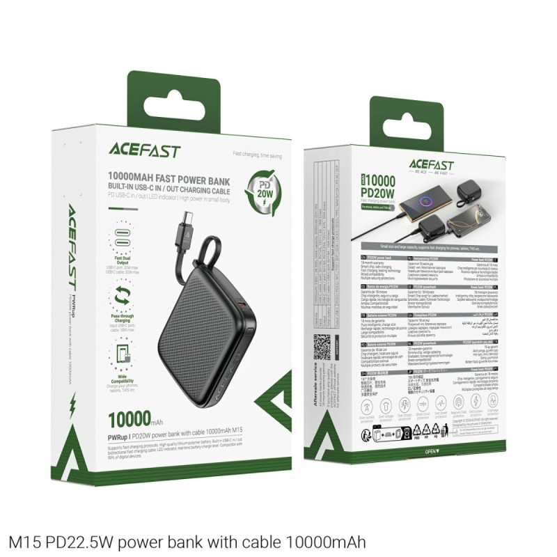 Deze ACEFAST 10000mAh externe batterij biedt snel, betrouwbaar opladen dankzij 20W PD-technologie, ideaal om compatibele apparaten efficiënt van stroom te voorzien. De geïntegreerde Type-C kabel vereenvoudigt het gebruik doordat u geen extra kabels hoeft mee te nemen. Compact en lichtgewicht, past gemakkelijk in een zak of tas. Vlamvertragende materialen en kobaltcellen garanderen extra duurzaamheid, terwijl internationale certificeringen veilig gebruik garanderen, zelfs op reis.