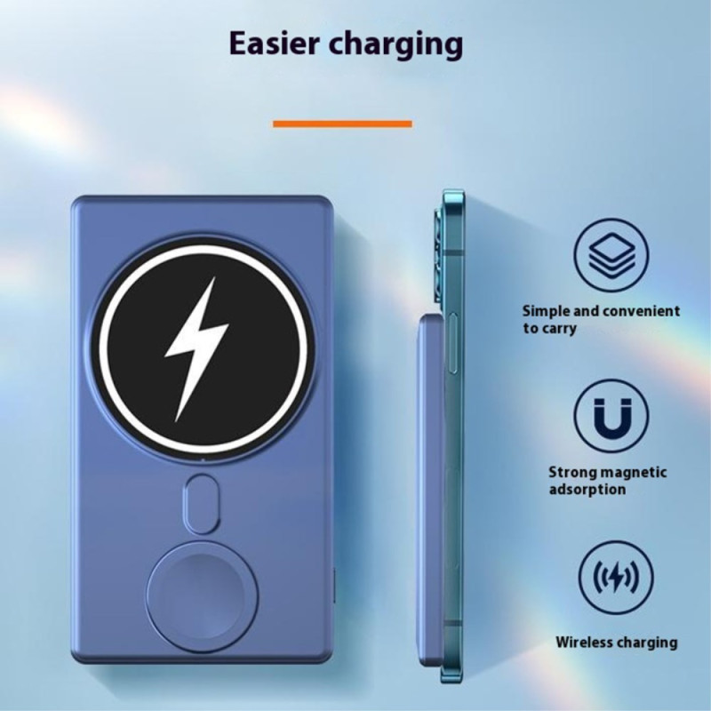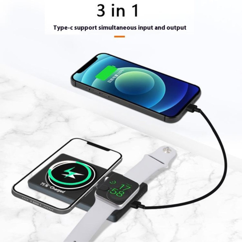 Deze 3-in-1 5000mAh externe batterij biedt een complete oplossing voor het opladen van een smartphone, koptelefoon en horloge, dankzij de speciale oplaadzones. Het magnetische systeem zorgt voor een stabiele grip en voorkomt dat hij wegglijdt tijdens gebruik. Compact en gemakkelijk mee te nemen, perfect voor dagelijks gebruik. Draadloos opladen is snel en efficiënt, met een rendement van 75%, terwijl je met de bidirectionele Type-C poort zowel de batterij kunt opladen als een ander apparaat van stroom kunt voorzien.