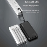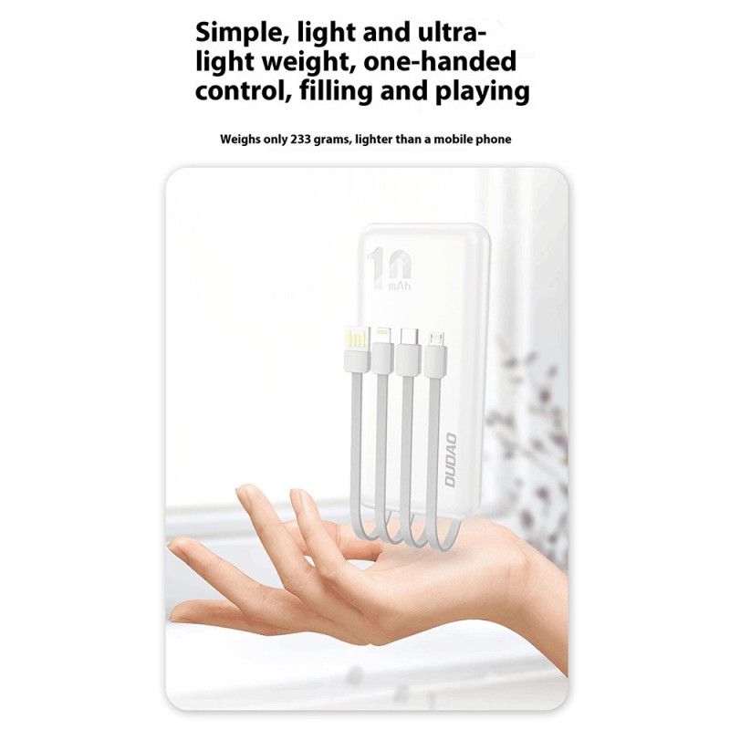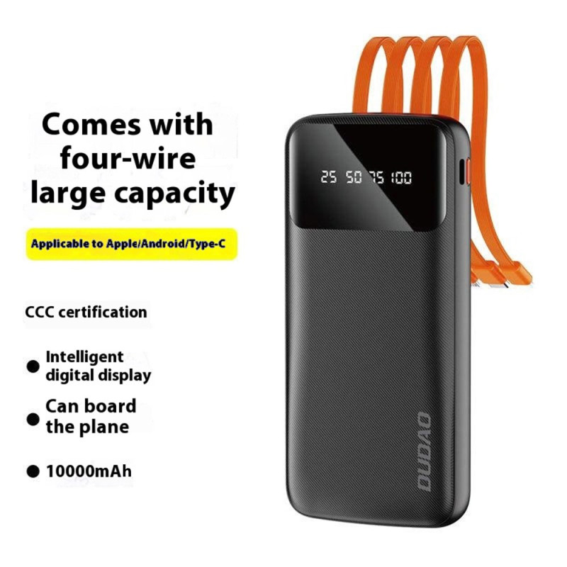 Deze DUDAO 10000mAh externe batterij biedt een praktische oplossing voor het opladen van verschillende apparaten zonder extra kabels mee te nemen. Het bevat drie output kabels en een USB input kabel, waardoor direct gebruik onderweg mogelijk is. In staat om tot vijf apparaten tegelijkertijd van stroom te voorzien, is het ideaal voor zowel persoonlijk gebruik als voor het delen van apparaten. Dankzij het compacte formaat is hij gemakkelijk vast te houden en in een tas te stoppen. Het digitale display met vier niveaus geeft duidelijk het resterende batterijniveau aan, zodat je kunt zien wanneer het tijd is om op te laden.