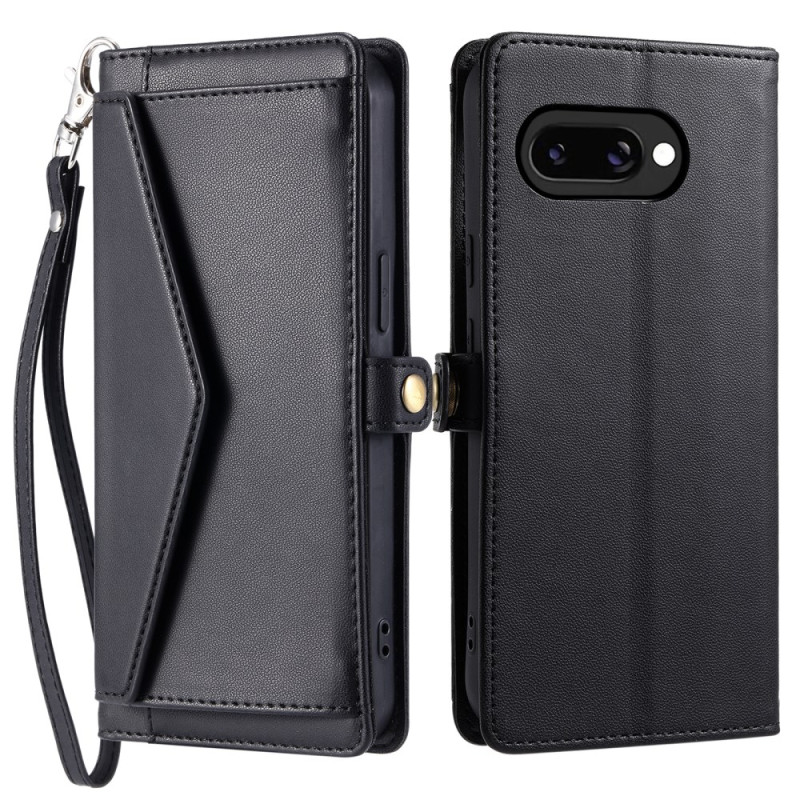 Stijlvolle portemonnee hoes voor Google Pixel 10A met praktische handband en verstelbare standaard. Voorzien van 3 kaartsleuven en 1 geldvakje. Volledige krasbescherming met hoorngat zodat je gesprekken kunt beantwoorden zonder de case te openen.