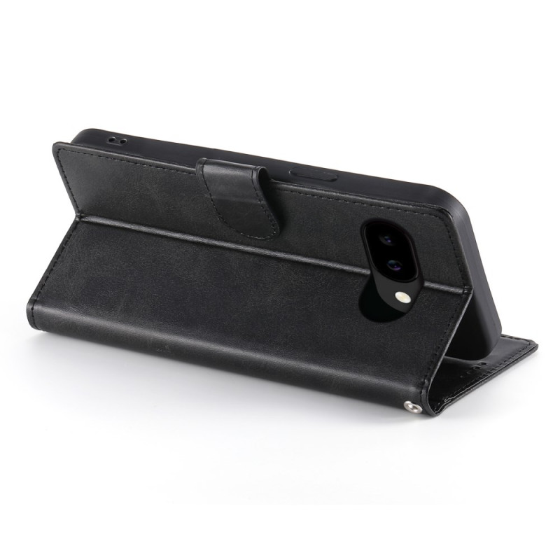Stijlvolle portemonneehoes voor Google Pixel 10A in kunstleer met structuur. Voorzien van een verstelbare standaard met meerdere hoeken, veilige magneetsluiting, 2 kaartsleuven en een praktische handriem voor eenvoudig dagelijks dragen.
