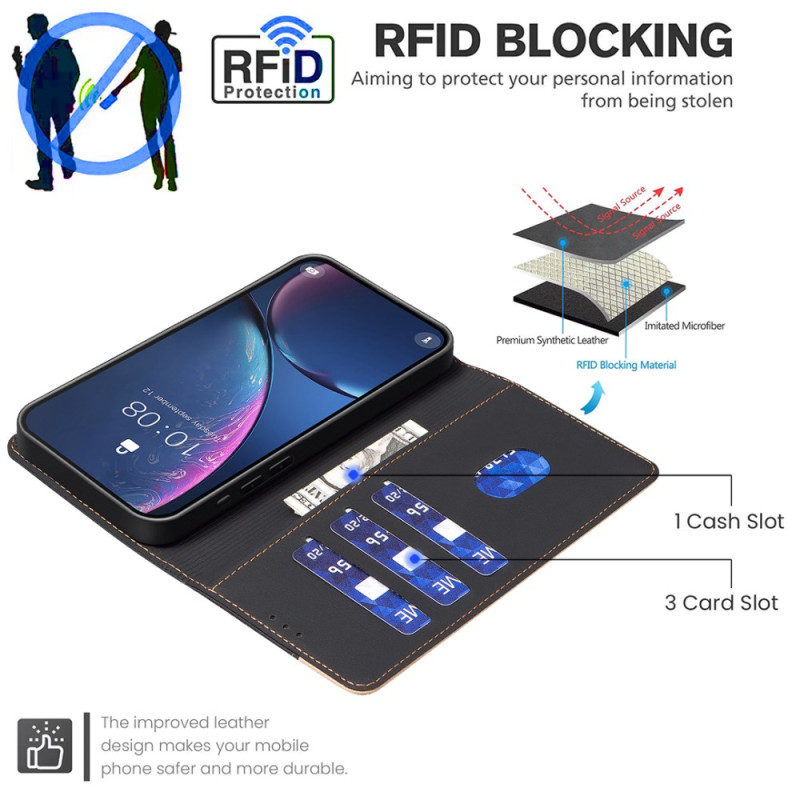 Geavanceerde premium kunstlederen etui met geïntegreerde RFID-blokkeringstechnologie. Met 3 kaartsleuven en 1 geldvak combineert hij elegantie en functionaliteit. Geïntegreerde standaardfunctie voor optimaal handsfree kijken.