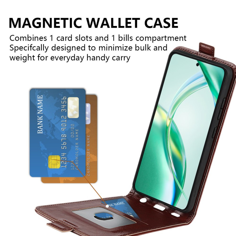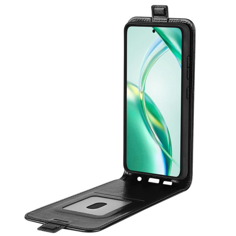 Étui à rabat vertical en cuir PU premium pour Honor 200 Smart 5G / X7c 4G. Design pratique avec ouverture vers le bas pour une utilisation à une main, emplacement pour carte intégré et fermeture magnétique sécurisée. Texture cuir effet vintage...