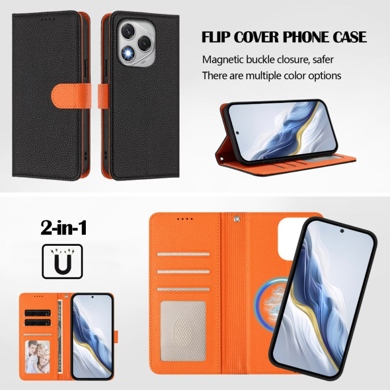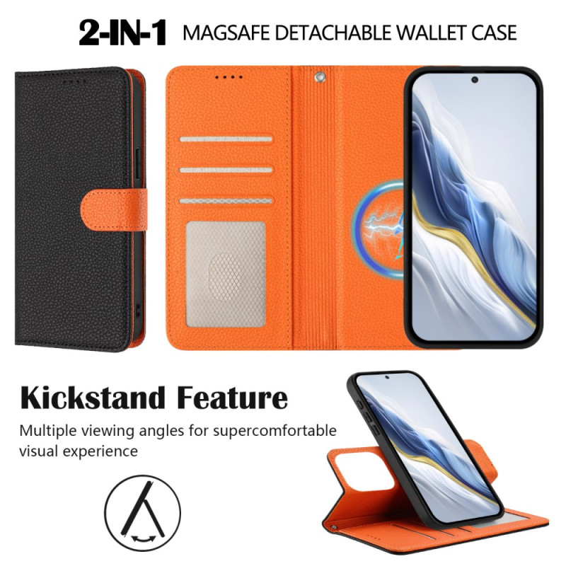 Stijlvolle lederen portemonnee hoes voor Honor 400 Lite 5G met afneembare magnetische sluiting. Inclusief 2 kaartsleuven, 1 fotovak, RFID-bescherming en afneembare handriem. Verfijnd tweekleurig ontwerp met een combinatie van TPU en synthetisch leer voor optimale bescherming.