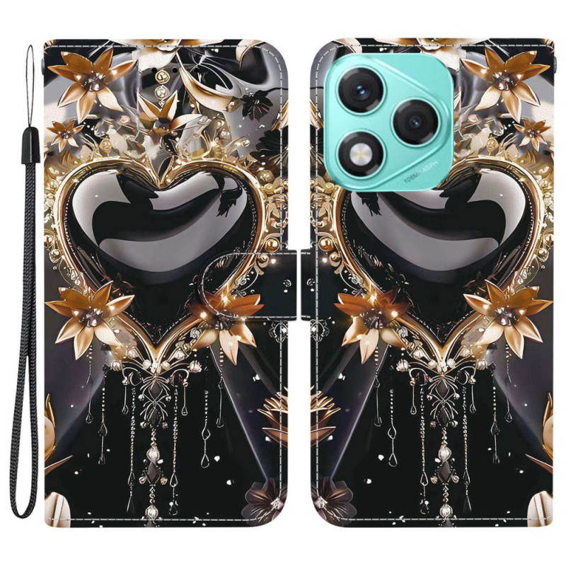 Elegant portemonneetasje met een verfijnd ontwerp van zwarte en gouden hartjes. Combineert stijl en functionaliteit met zijn kaartcompartimenten, opvouwbare houder en bijpassende handriem. Volledige magnetische bescherming voor uw Honor 400 Lite 5G.