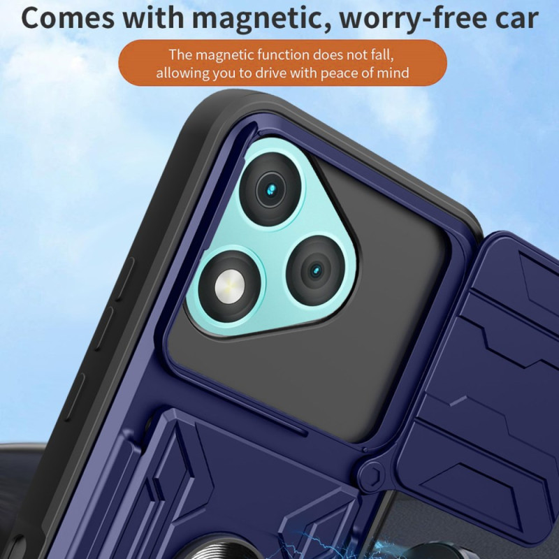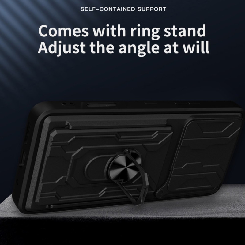 Robuuste hoes voor Honor 400 Lite 5G met intrekbare metalen kickstand, verschuifbare camerabescherming en geïntegreerde kaarthouder. Compatibel met magnetische autohouder. Versterkte bescherming tegen stoten en vallen.