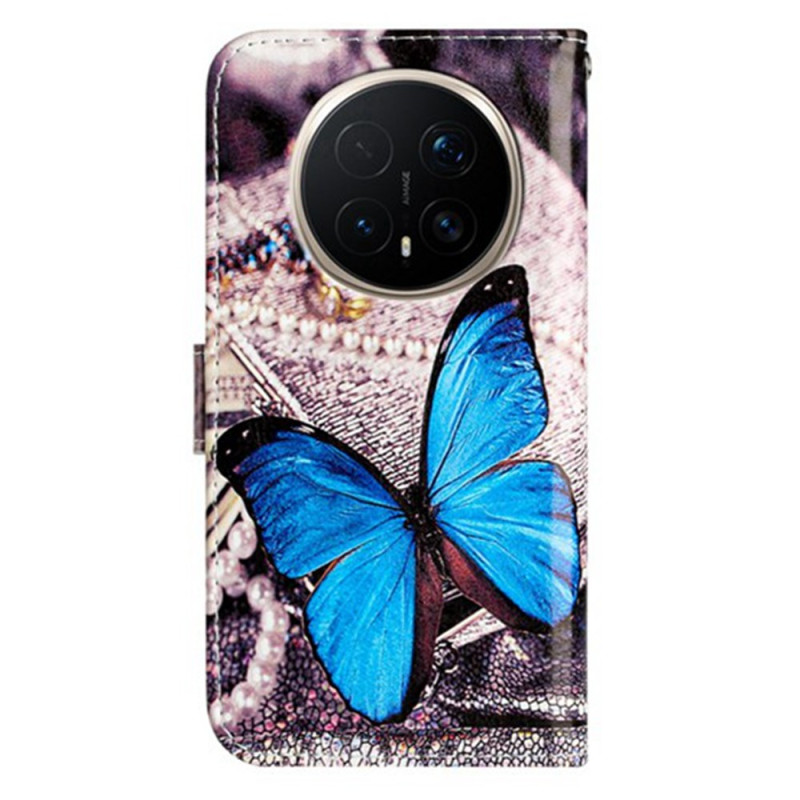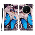 Elegante portemonnee hoes met blauw vlindermotief voor Honor Magic 8 Pro 5G. Geraffineerd ontwerp met multi-angle ondersteuningsfunctie, veilige magnetische sluiting en afneembare handriem. Beschermt je telefoon en houdt pasjes en geld bij de hand.