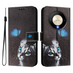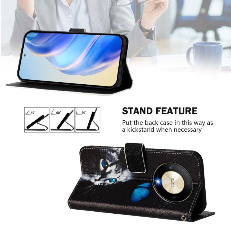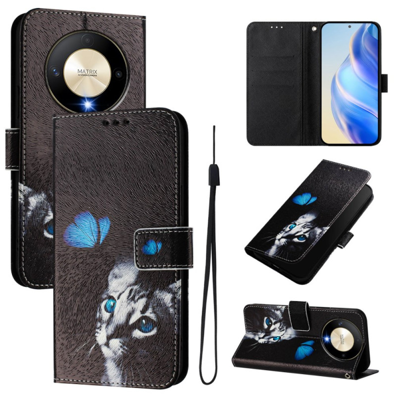 Stijlvolle portemonneehoes met charmant vlinder- en kattenmotief. Voorzien van een verstelbare houder met meerdere hoeken, 3 kaartsleuven, veilige polsband en versterkte valbescherming.