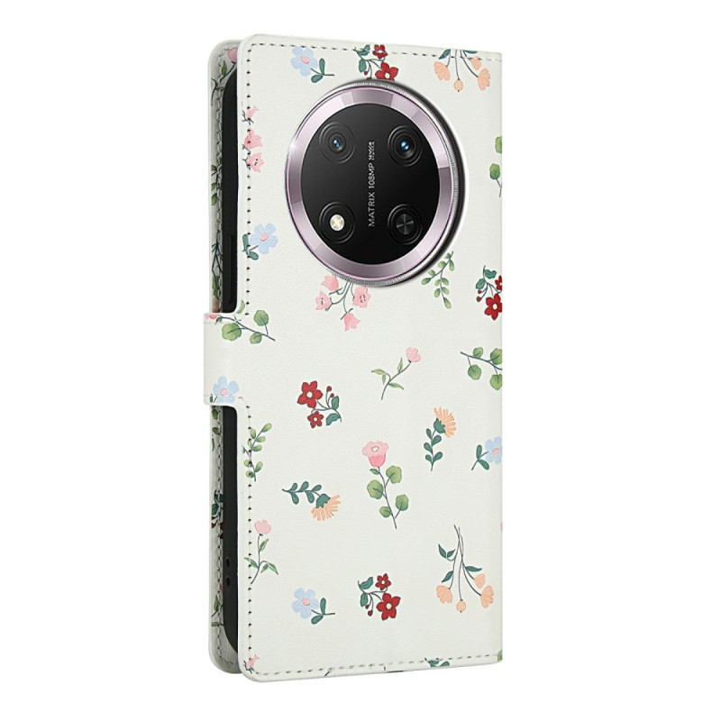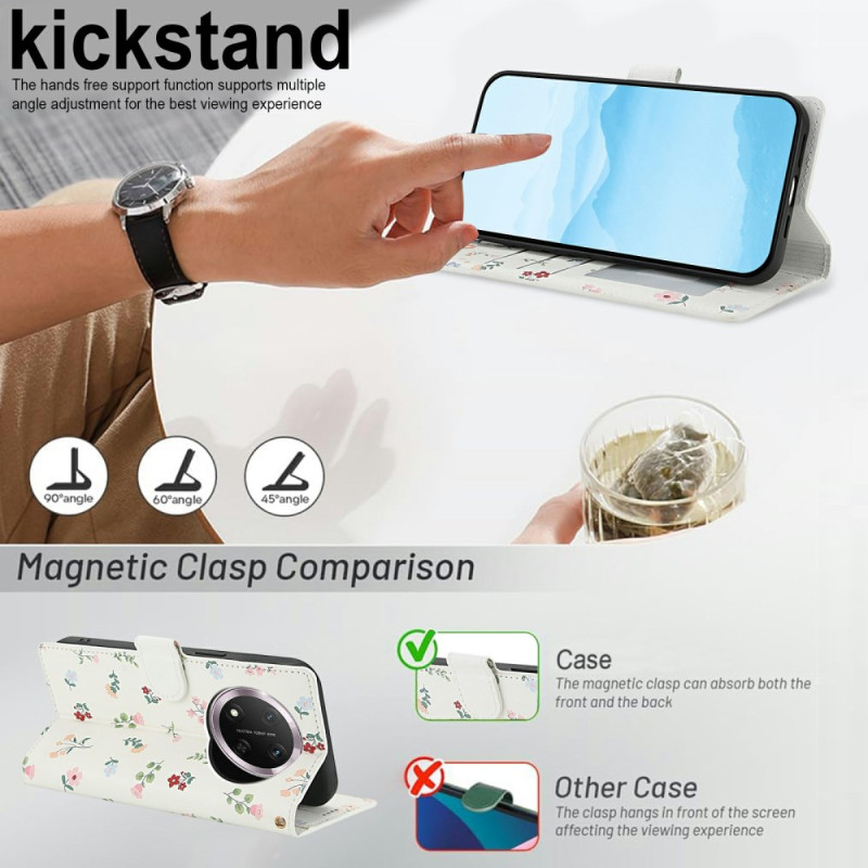 Elegante portemonneehoes van PU-leer met geraffineerd bloemendesign. Volledige bescherming met flexibele TPU-binnenlaag. Meerdere vakjes voor pasjes en geld. Verstelbare standaardfunctie voor optimaal handsfree kijken.