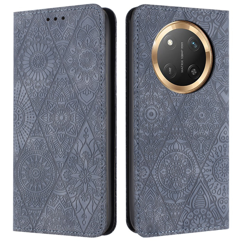 Elegante portemonneehoes met gegraveerd bloemmotief voor Honor Magic 7 Lite / X9c. Voorzien van 2 kaartsleuven, 1 geldvakje en een verstelbare houder voor handsfree kijken. Volledige bescherming tegen stoten en vallen.