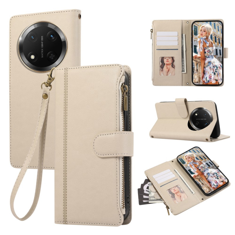 Multifunctionele PU-leren hoes met ritssluiting en meerdere kaartsleuven. Combineert optimale bescherming en alledaags gebruiksgemak met afneembare handriem en geïntegreerde houder voor een handsfree ervaring.