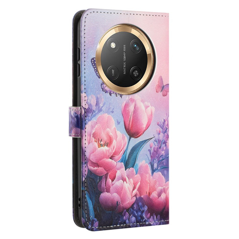 Bescherm je Honor Magic 7 Lite / X9c in stijl met deze portemonneehoes met bloemenmotief en roze vlinders. Praktisch ontwerp met geïntegreerde kaarthouder, uitklapbare standaard en magnetische sluiting. Wordt geleverd met een afneembaar sleutelkoord voor eenvoudig transport.
