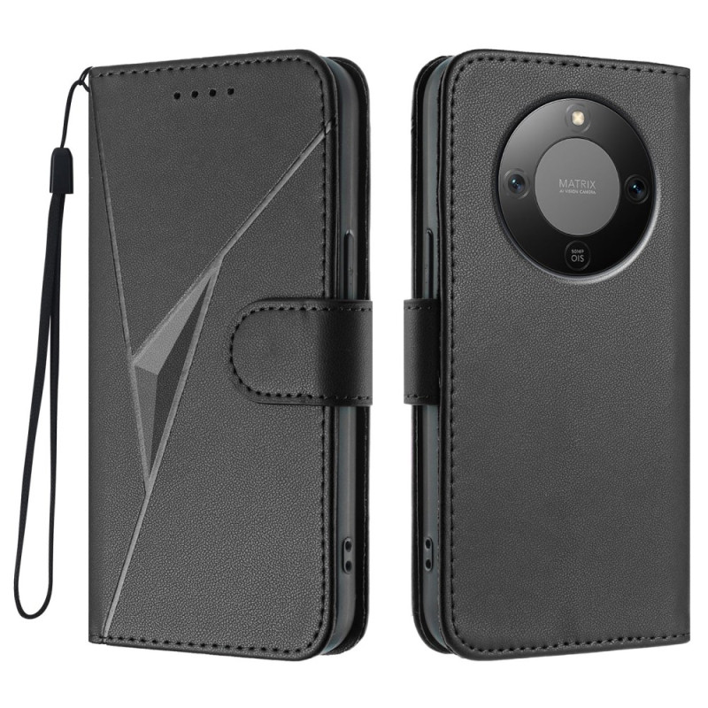 Elegante portemonneehoes met geraffineerd driehoekmotief, veilige magneetsluiting en praktische handriem. Gemaakt van eersteklas PU-leer en zacht TPU voor optimale bescherming. Biedt ruimte aan drie pasjes en contant geld.