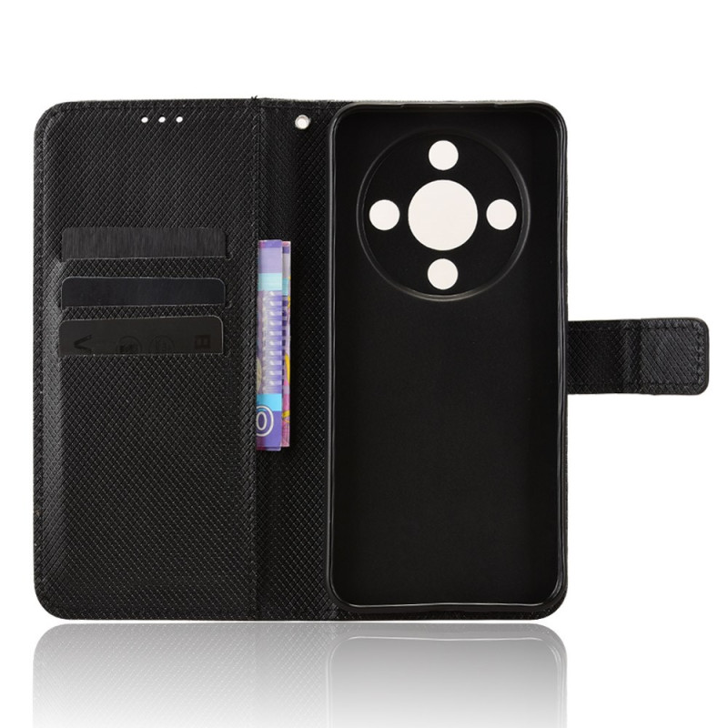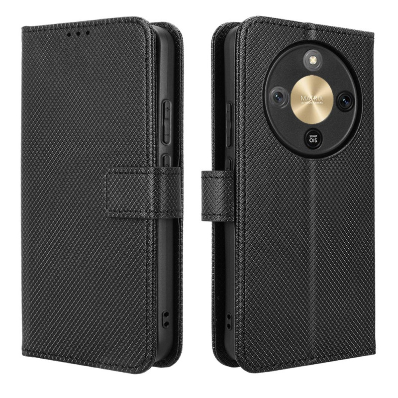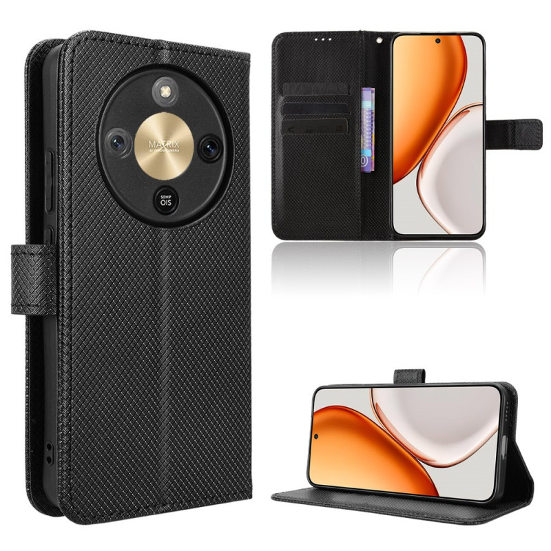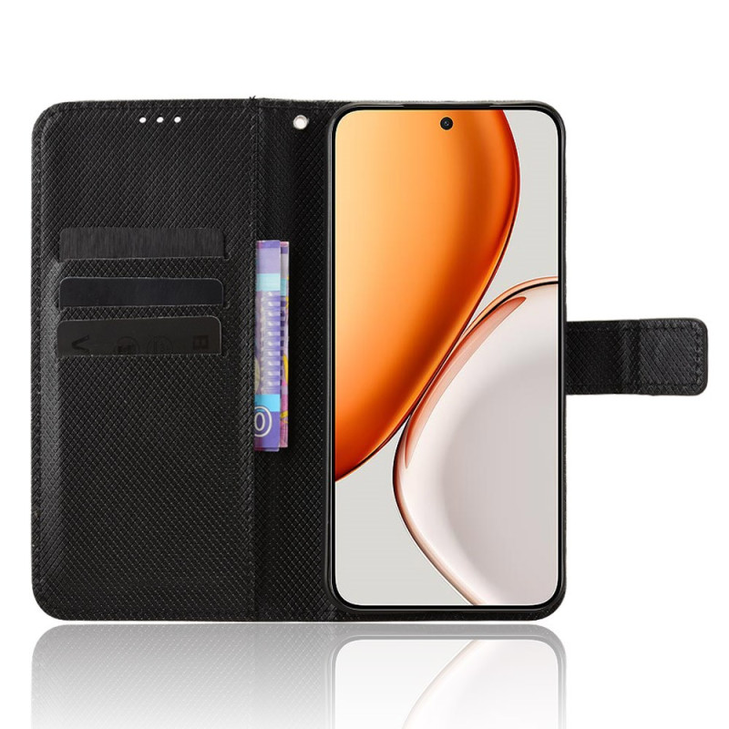 Elegante portemonneehoes met diamantstructuur voor Honor Magic 8 Lite. Voorzien van kaartsleuven, geldvakje en praktische handriem. Veilige magnetische sluiting en geïntegreerde opvouwbare standaard voor handsfree kijken.