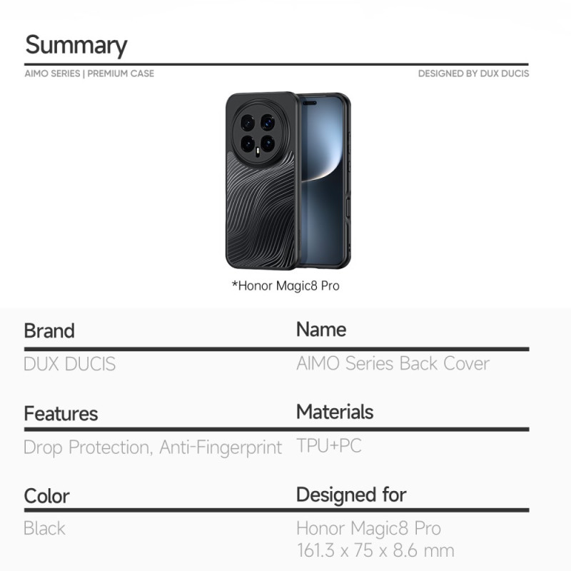 Bescherm je Honor Magic 8 Pro 5G in stijl met de DUX DUCIS Aimo Series hoes. Het hybride ontwerp biedt robuuste bescherming tegen vallen tot 1,2 m, SGS-gecertificeerd.