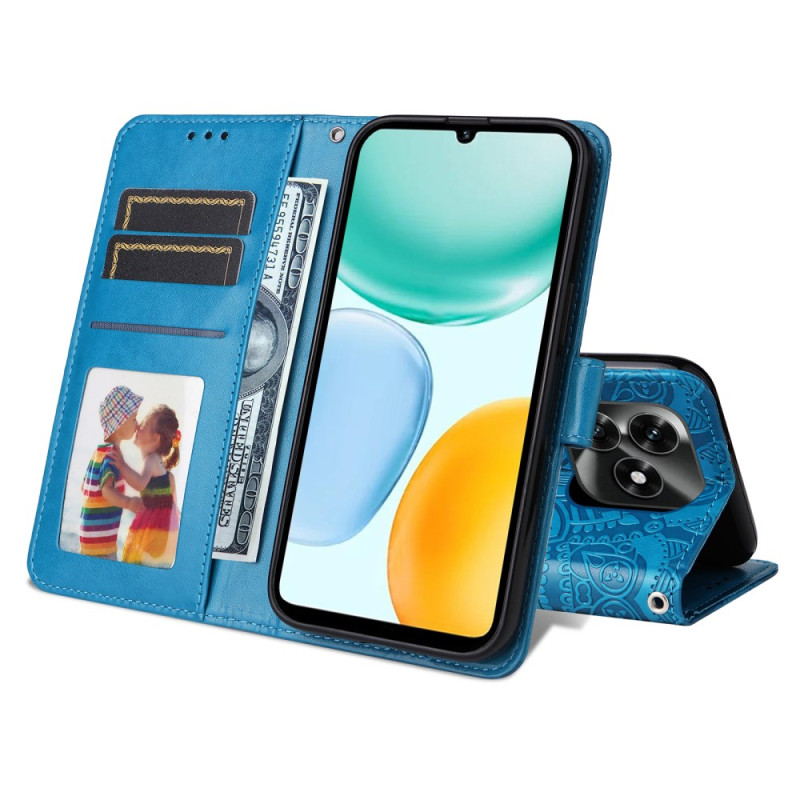 Elegante PU lederen hoes met TPU binnenzijde voor volledige bescherming. Voorzien van bedrukte zonnebloemmotieven, kaartsleuven, standaardfunctie en magneetsluiting. Ontworpen voor praktisch gebruik met een opening voor een oortelefoon en een handriem.