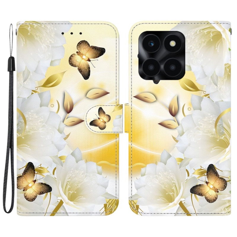 Élégant étui portefeuille en cuir PU pour Honor X6a 4G avec un superbe motif papillon doré et fleurs. Combine style et fonctionnalité avec support intégré, rangements pour cartes et dragonne pratique. Protection complète tout en gardant un accès facile à toutes les fonctionnalités.