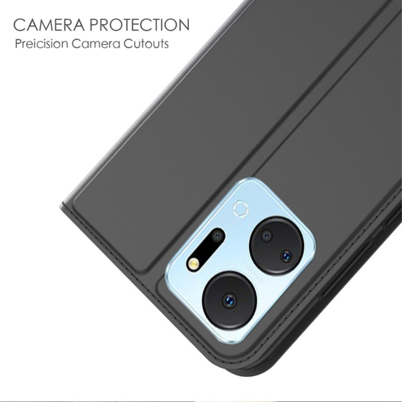 Elegant portemonnee-etui voor Honor X7a 4G met zijdeachtige textuur. Met praktische kaarthouder, geïntegreerde verstelbare standaard en veilige magnetische sluiting. Volledige bescherming tegen alledaagse krassen en stoten.