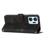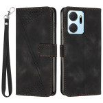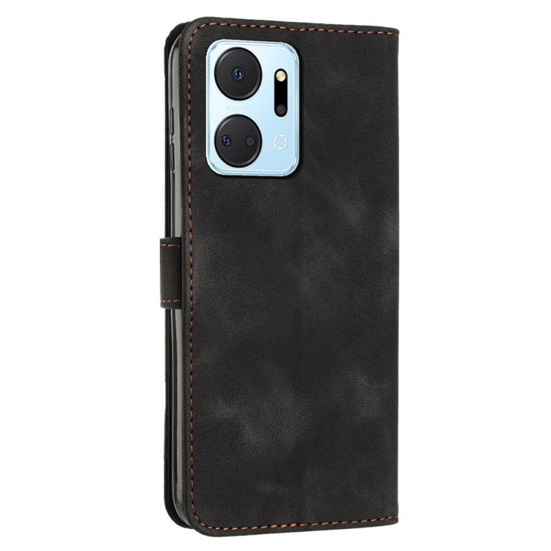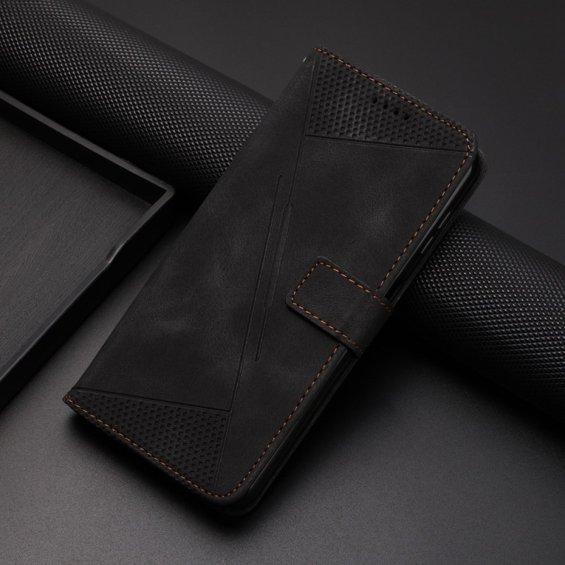Elegante portemonnee hoes in PU leer en TPU voor Honor X7a 4G. Modern ontwerp met driehoekig patroon, geïntegreerde standaardfunctie, 3 kaartsleuven en veilige magnetische sluiting. Volledige bescherming tegen alledaagse schokken.
