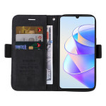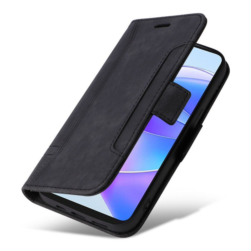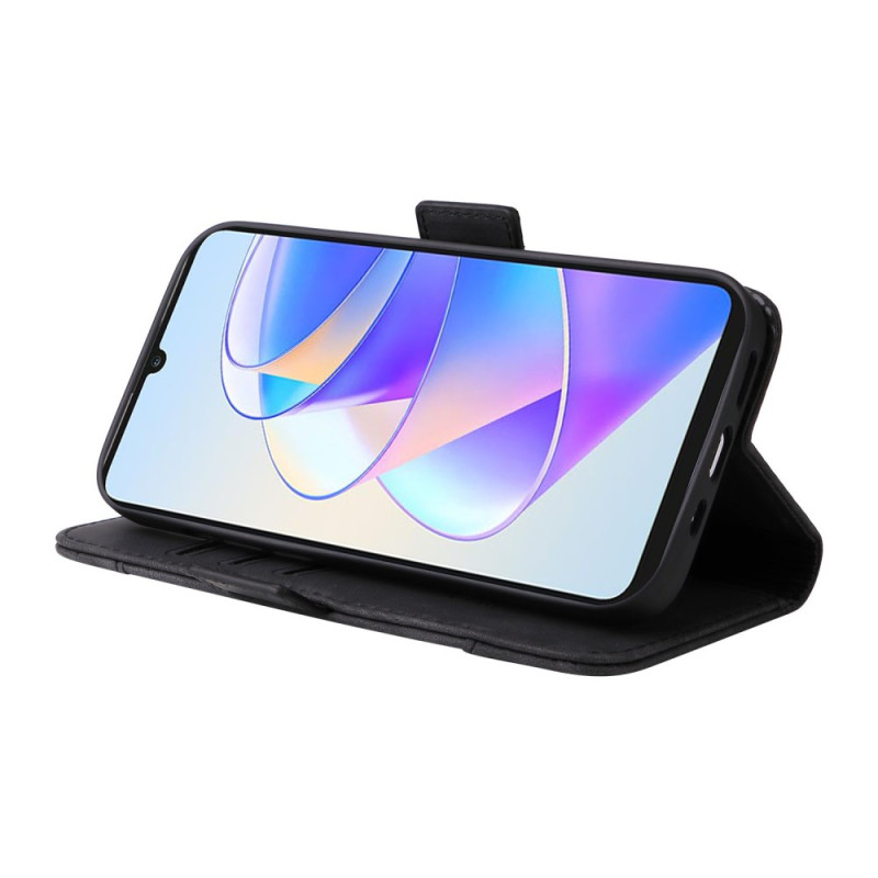 Elegante PU lederen portemonnee hoes met geïntegreerde standaard voor Honor X7a 4G. Voorzien van 3 kaartsleuven, 1 ticketvakje en een dubbele magnetische sluiting voor optimale veiligheid. Geraffineerd ontwerp met bedrukt lijnenpatroon.