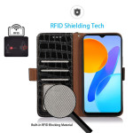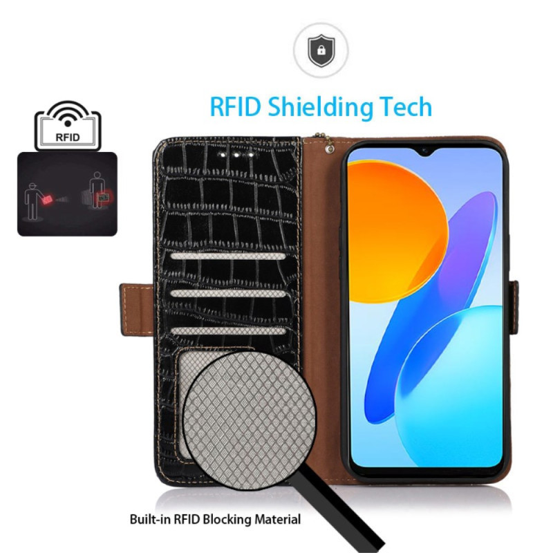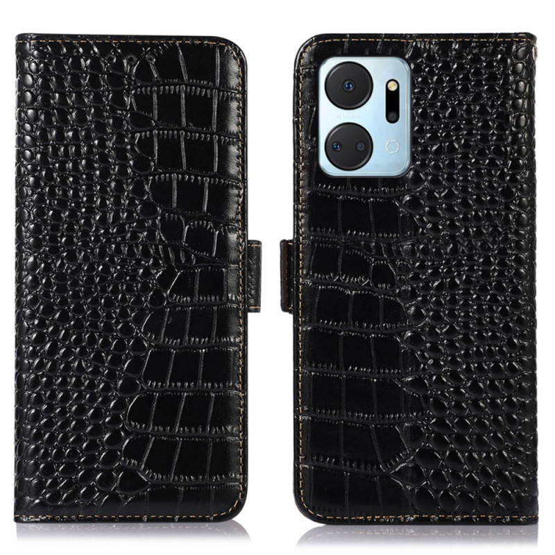 Elegante portemonneehoes van echt leer met krokodillenstructuur voor Honor X7a 4G. Voorzien van 3 kaartsleuven, 1 geldvakje en RFID-blokkeringstechnologie. Geïntegreerde verstelbare standaard voor comfortabel kijken.