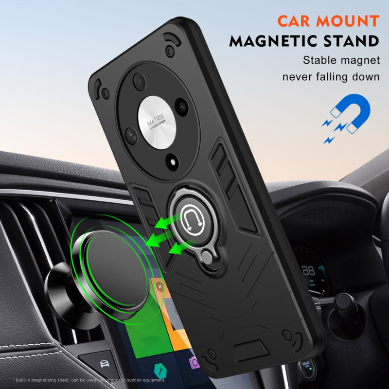 Bescherm uw Honor X9b 5G met deze robuuste hoes van PC en TPU. Hij is voorzien van een roterende steunring, een geïntegreerde kickstand en een verschuifbare lenskap en biedt optimale bescherming en gebruiksgemak voor dagelijks gebruik.