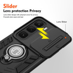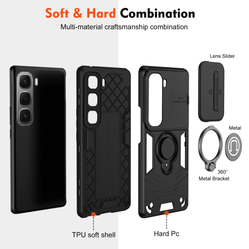 Volledige bescherming voor uw Infinix Hot 60i 4G, een combinatie van stijl en functionaliteit. Met een innovatieve verschuifbare camerabeveiliging, een geïntegreerde standaard en een metalen ring voor een stevige grip. Compatibel met magnetische houders.