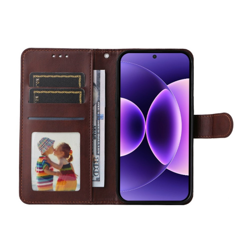 Stijlvolle portemonneehoes van gestructureerd leer met 3 kaartsleuven, uitklapbare standaard en afneembare handriem. Inclusief ultradunne beschermfolie van 0,18 mm die compatibel is met ultrasone ontgrendeling van vingerafdrukken voor volledige bescherming.