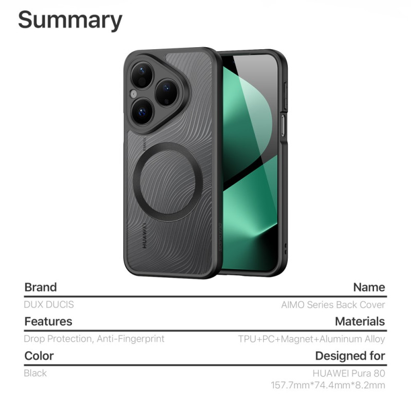Bescherm je Huawei Pura 80 in stijl met dit REACH-gecertificeerde DUX DUCIS hoesje. Hij is ultradun en lichtgewicht en biedt schokbescherming getest tot 1,2 m, terwijl hij MagSafe-compatibel blijft voor optimaal draadloos opladen.