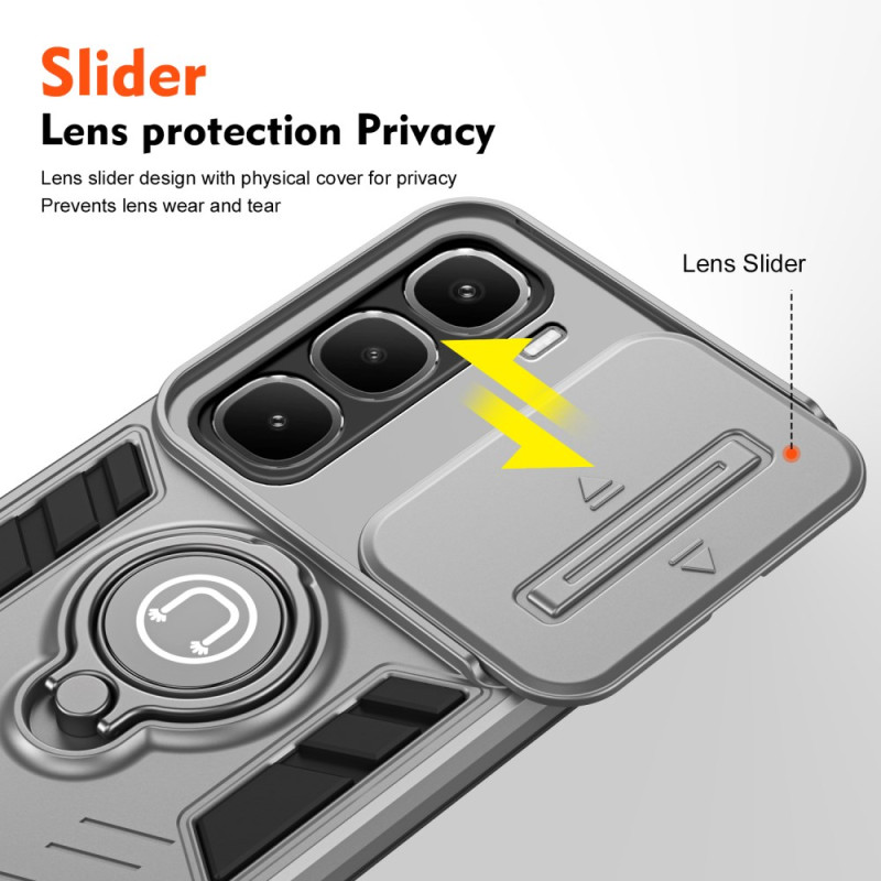 Bescherm je Infinix Hot 60 Pro 4G met deze innovatieve case met een verschuifbare camerabescherming, een geïntegreerde steunring en een kickstand. Compatibel met magnetische autohouders, biedt het volledige bescherming.