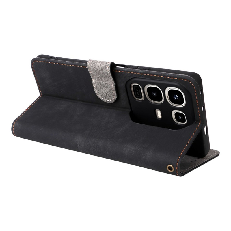 Multifunctionele portemonnee hoes met RFID-bescherming voor Infinix Note 50 4G en Note 50 Pro 4G. Elegant ontwerp met 3 kaartsleuven, handsfree houder en inbegrepen handriem. Volledige bescherming tegen alledaagse schokken.