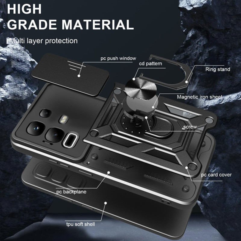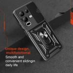 Volledige bescherming voor je Infinix Note 50X 5G met verschuifbare cameradeksel, multi-angle roterende houder en militaire schokbestendigheid. Compatibel met magnetische autohouders. Ergonomisch antikrasontwerp.