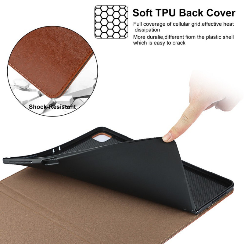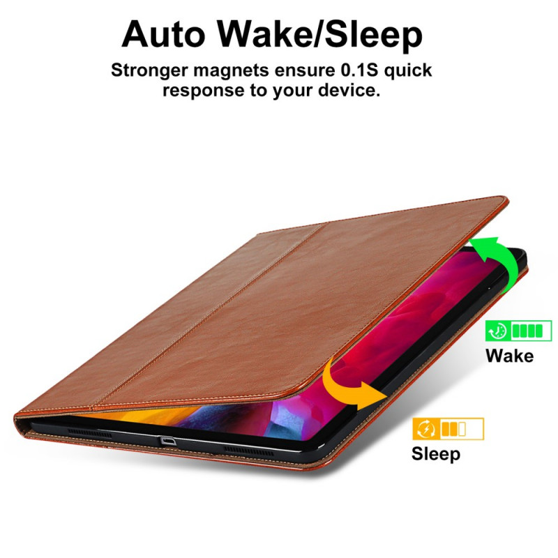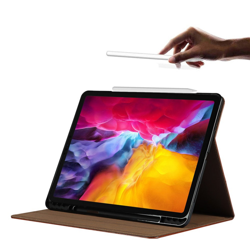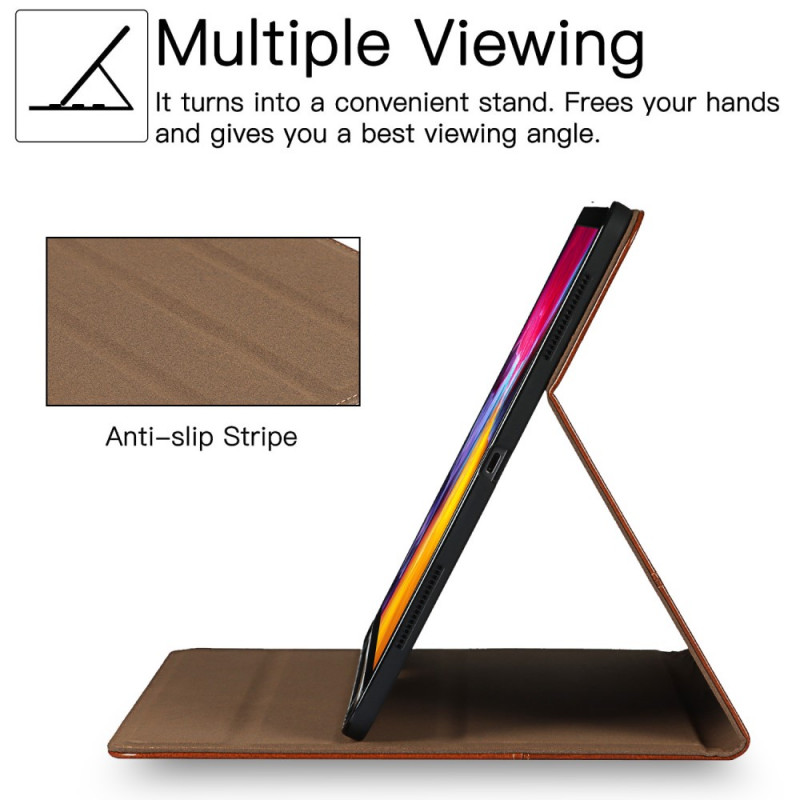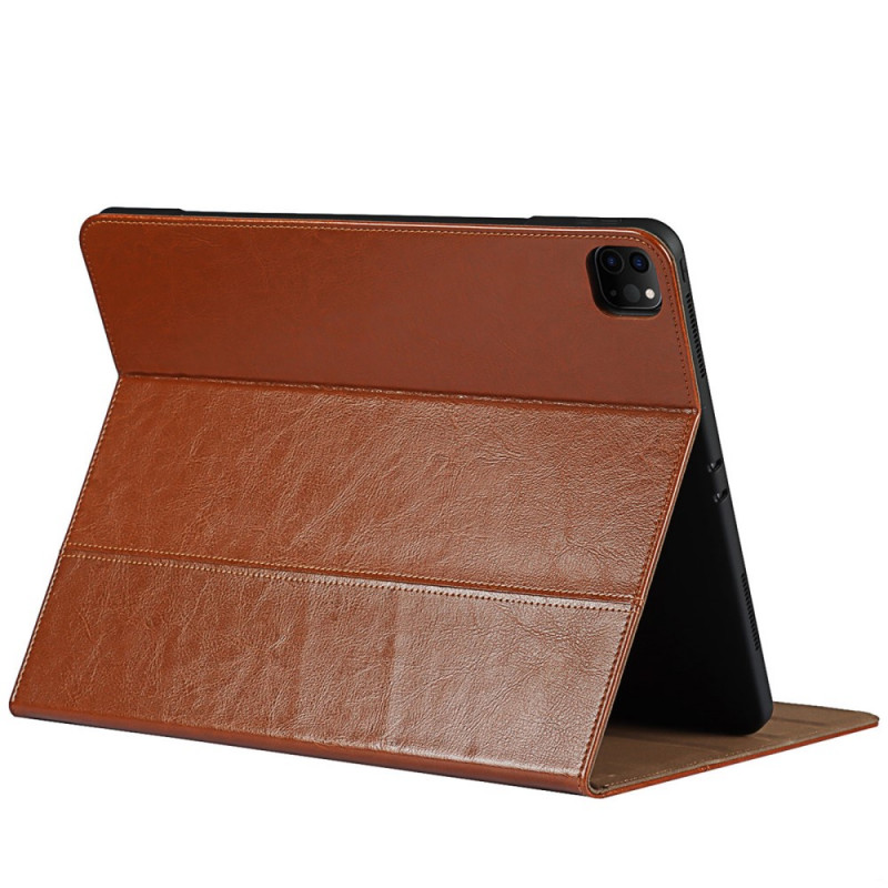 De echt lederen hoes biedt eersteklas bescherming voor je iPad Pro 12.9" (2022) (2021) (2020) en doet tevens dienst als handsfree standaard.