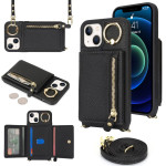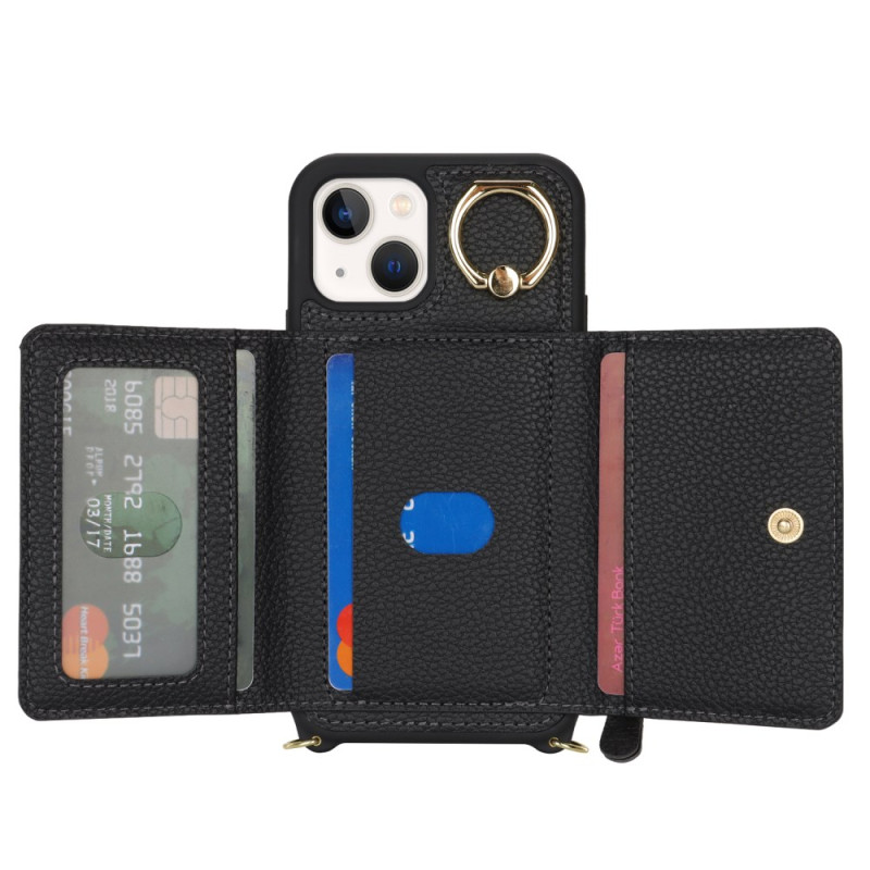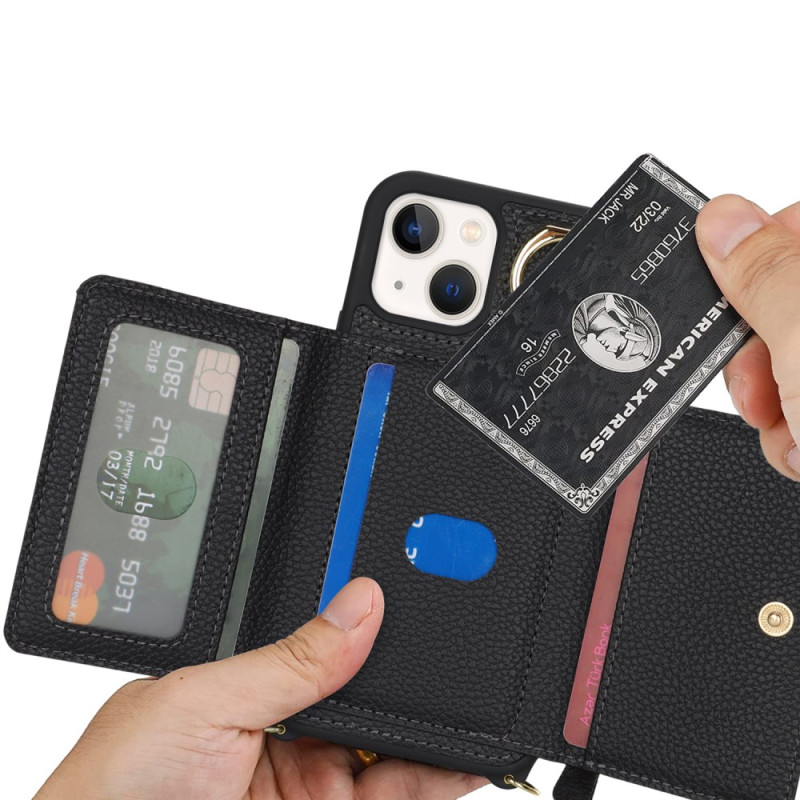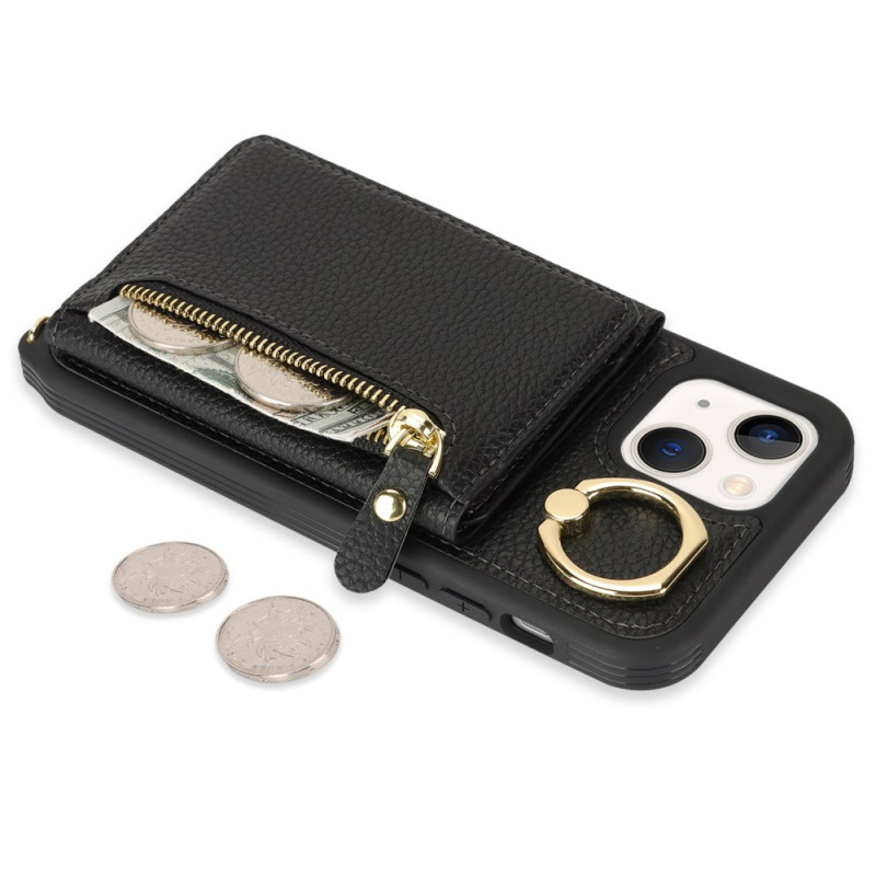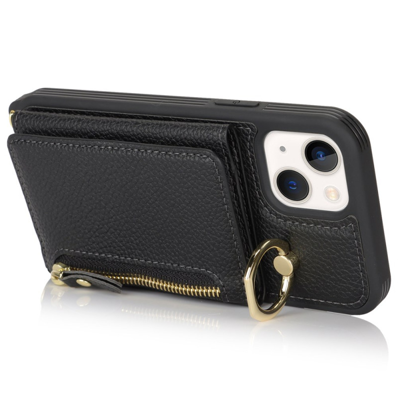 Multifunctionele hoes van PU leer en TPU voor iPhone 13 Mini. Geïntegreerd vak met rits voor je essentials, creditcardvakjes en roterende steunring. Wordt geleverd met een afneembare schouderriem voor praktisch dagelijks dragen.