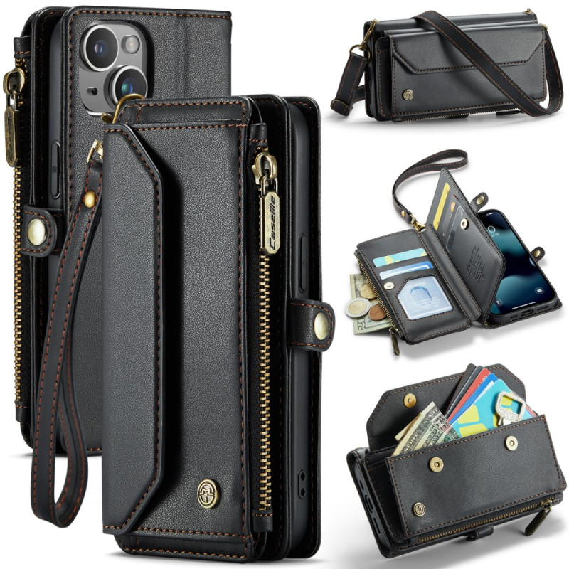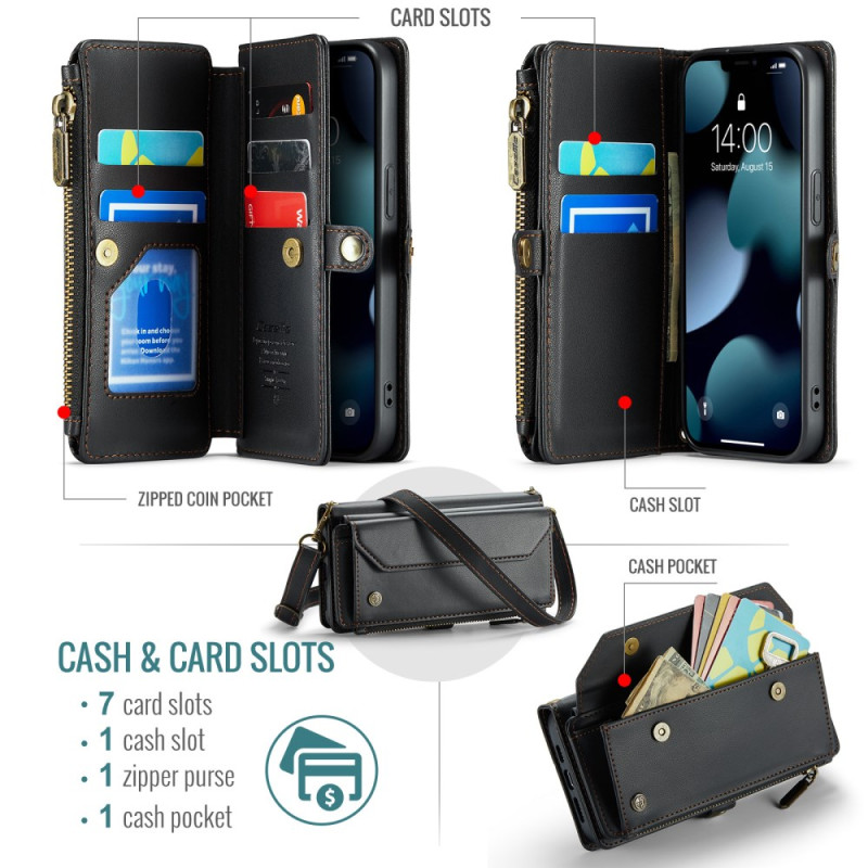 Ontdek de CASEME multifunctionele hoes voor iPhone 13 mini: RFID-bescherming, 10 kaartsleuven, portemonnee met rits en afneembare schouderriem. Combineer stijl, veiligheid en functionaliteit met deze eersteklas PU-leren portemonnee.
