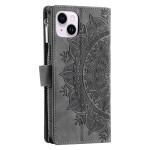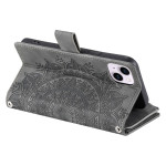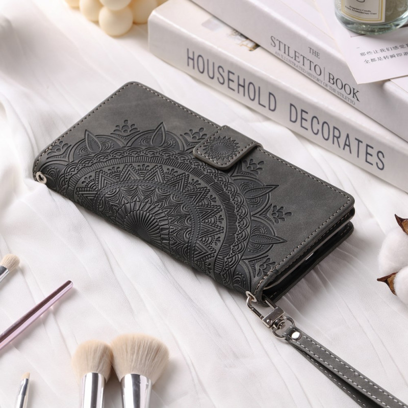 Stijlvolle portemonneehoes voor iPhone 13 Mini met gegraveerd mandala-motief. Voorzien van meerdere kaartsleuven, ritsvak, veilige magneetsluiting en handige handriem. Geïntegreerde standaardfunctie voor handsfree kijken.