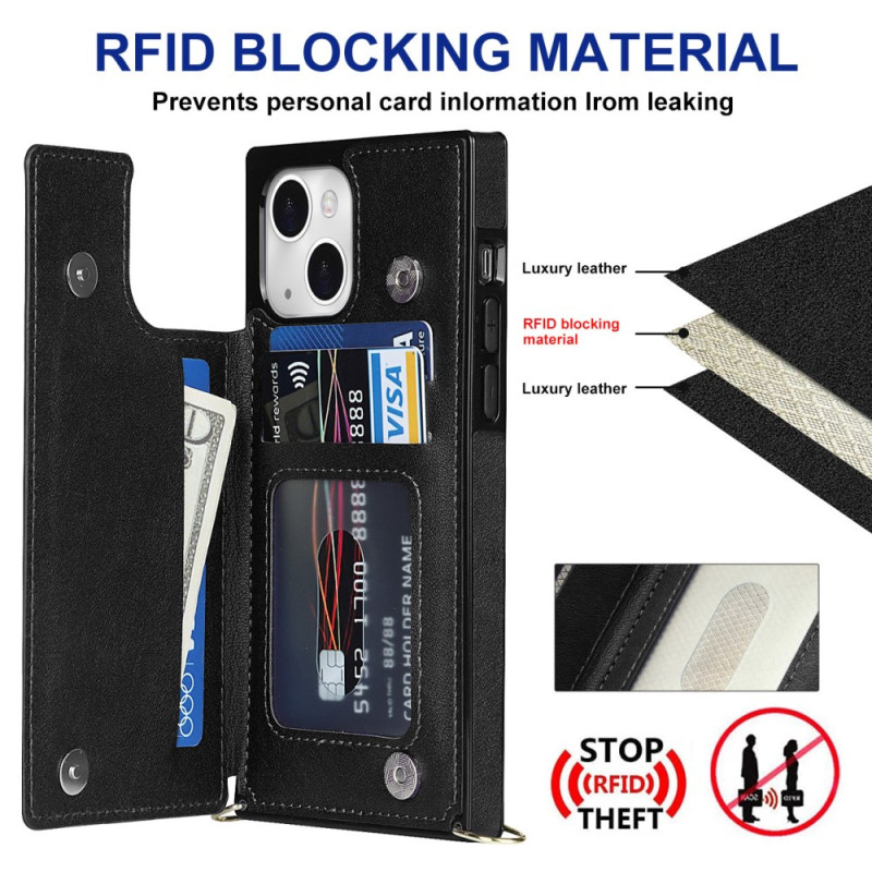 Multifunctionele hoes voor iPhone 13 Mini met RFID-bescherming, opvouwbare standaard en lange schouderriem. Met kaartsleuven en een veilige magneetsluiting beschermt het je telefoon terwijl je je spullen bij de hand houdt.