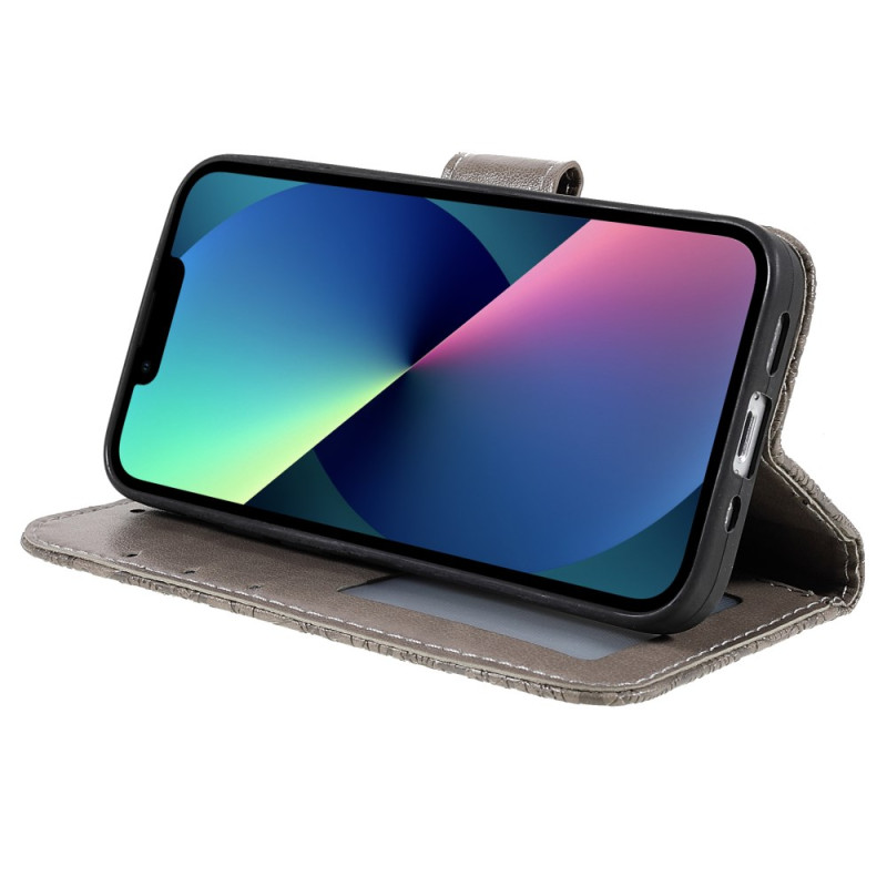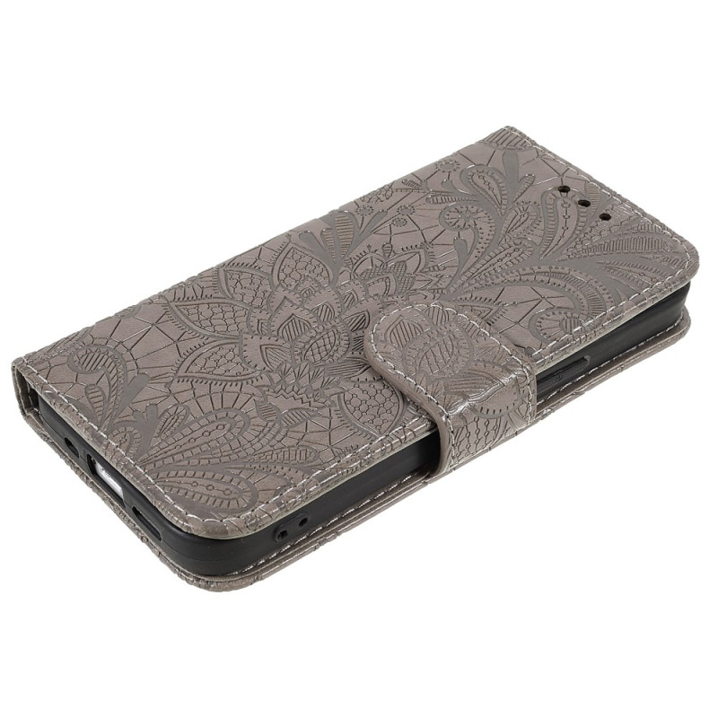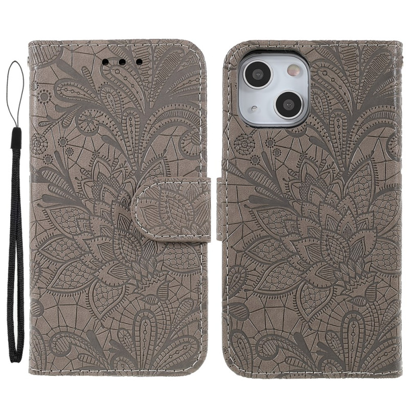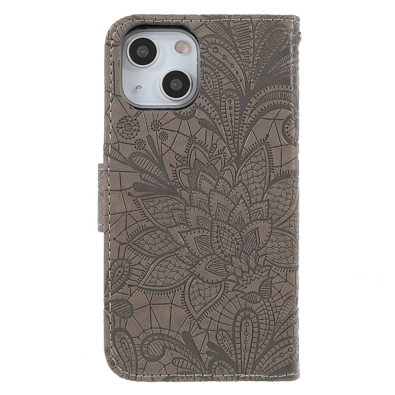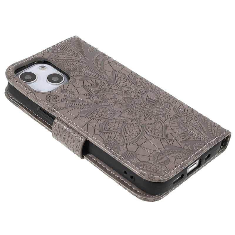 Ontdek deze elegante portemonneehoes met klep met kanten bloemmotief. Met meerdere kaartsleuven, een praktische standaardfunctie en een veilige polsband combineert hij verfijnde stijl met optimale bescherming voor je iPhone 13 mini.