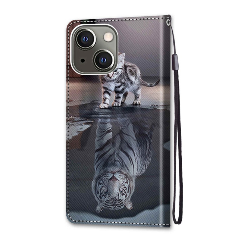 Bescherm je iPhone 13 Mini in stijl met deze portemonneehoes met kenmerkend kat/tijger-motief. Met een praktische opvouwbare standaard, geïntegreerde kaartsleuven en een handriem combineert hij elegantie en functionaliteit.
