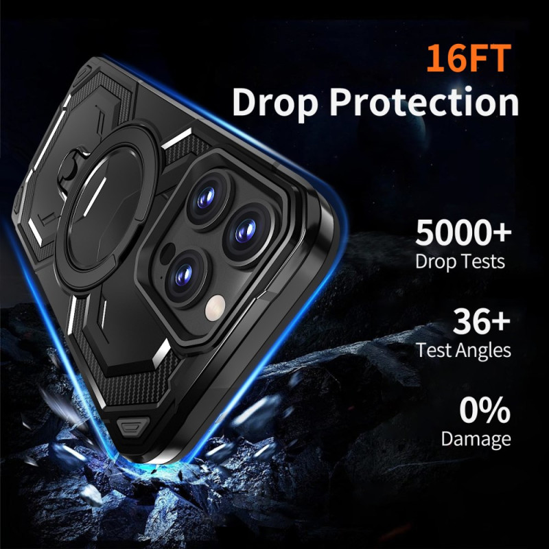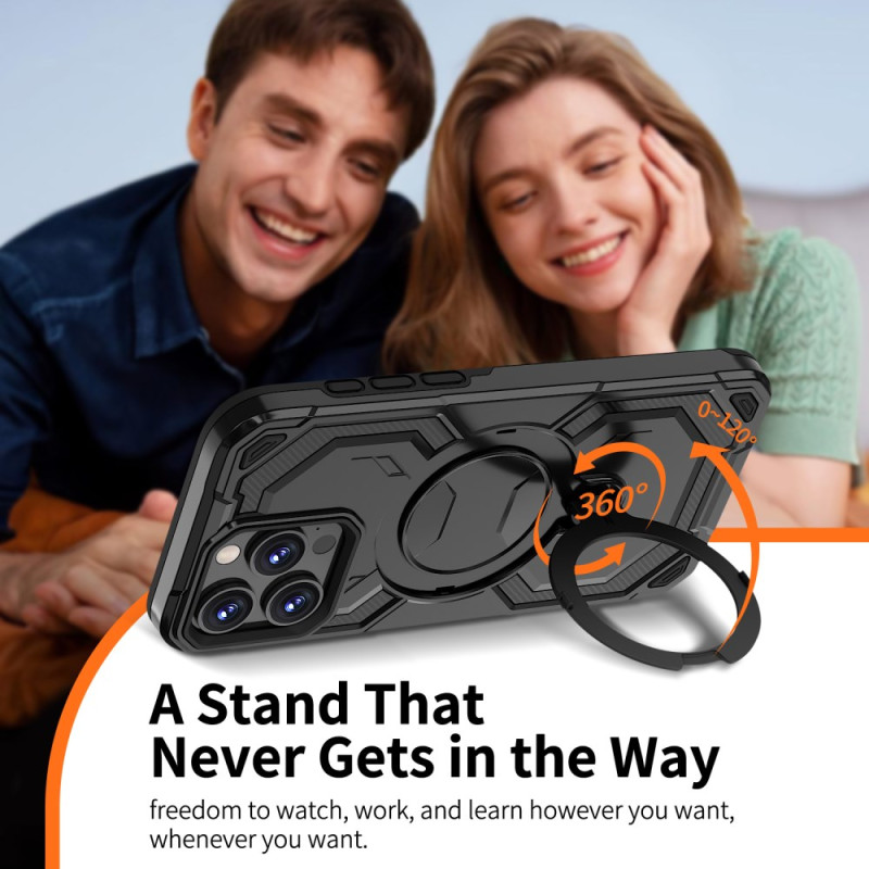 Bescherm je iPhone 13 Pro Max met deze ultrabestendige PC + TPU hybride hoes. Met een multifunctionele magnetische ring die fungeert als kickstand en compatibel is met draadloze opladers, combineert hij maximale bescherming met alledaags gebruiksgemak.