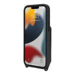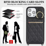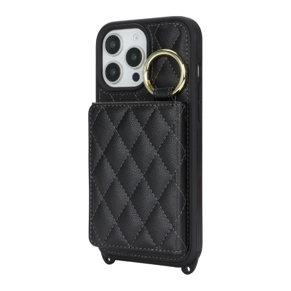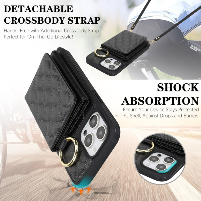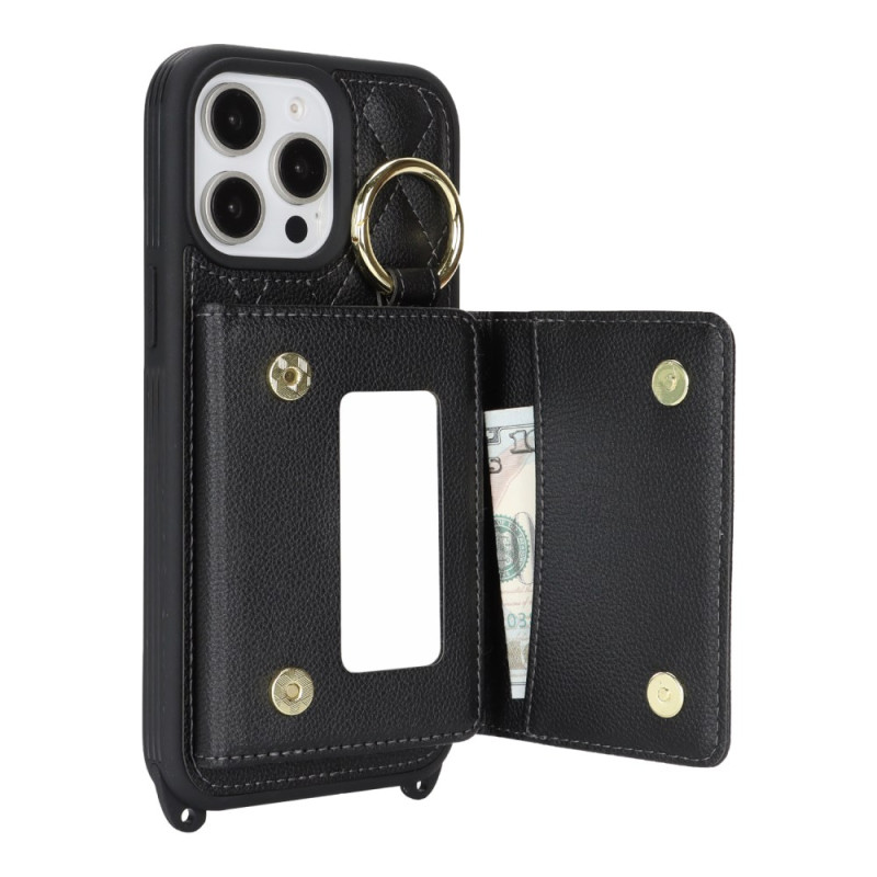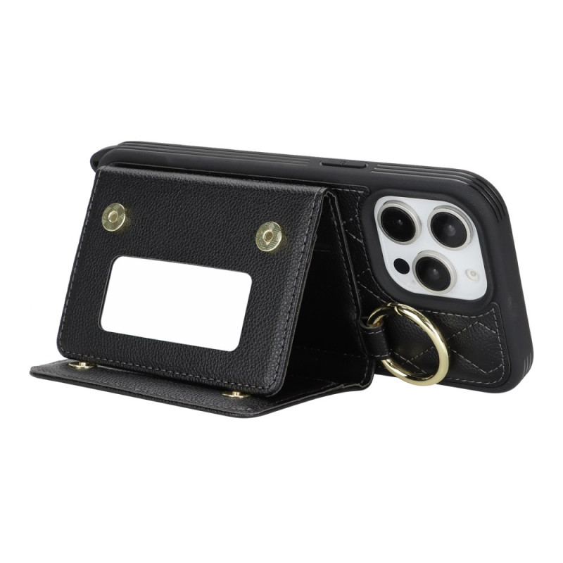 Multifunctionele hoes met verstelbaar sleutelkoord, 3 kaartsleuven, geïntegreerde spiegel en RFID-bescherming. Elegant ontwerp met rasterpatroon en opvouwbare standaard voor optimaal handsfree gebruik.